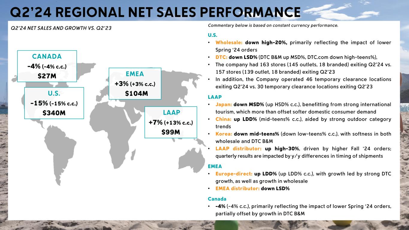 Net sales decreased 8 percent (7 percent constant-currency) to $570.2 million from $620.9 million for the comparable period in 2023. The decline in net sales primarily reflects lower wholesale net sales in the United States ("U.S.") due to retailer cautiousness, a difficult competitive environment, and generally soft consumer demand.