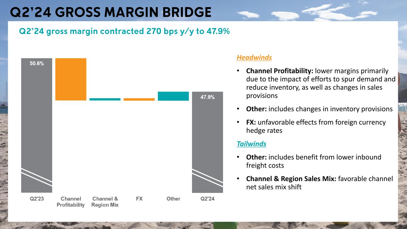 Gross margin contracted 270 basis points to 47.9 percent of net sales from 50.6 percent of net sales for the comparable period in 2023. Gross margin contraction primarily reflects the impact of efforts to spur demand and reduce inventory in the U.S., as well as changes in sales provisions, partially offset by lower inbound freight costs.