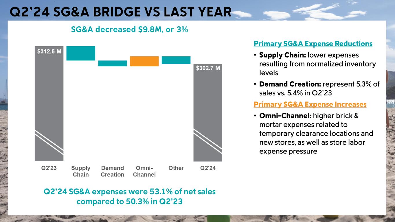 SG&A expenses were $302.7 million, or 53.1 percent of net sales, compared to $312.5 million, or 50.3 percent of net sales, for the comparable period in 2023. The largest changes in SG&A expenses primarily reflect lower supply chain and variable demand creation expenses, partially offset by higher direct-to-consumer ("DTC") expenses.