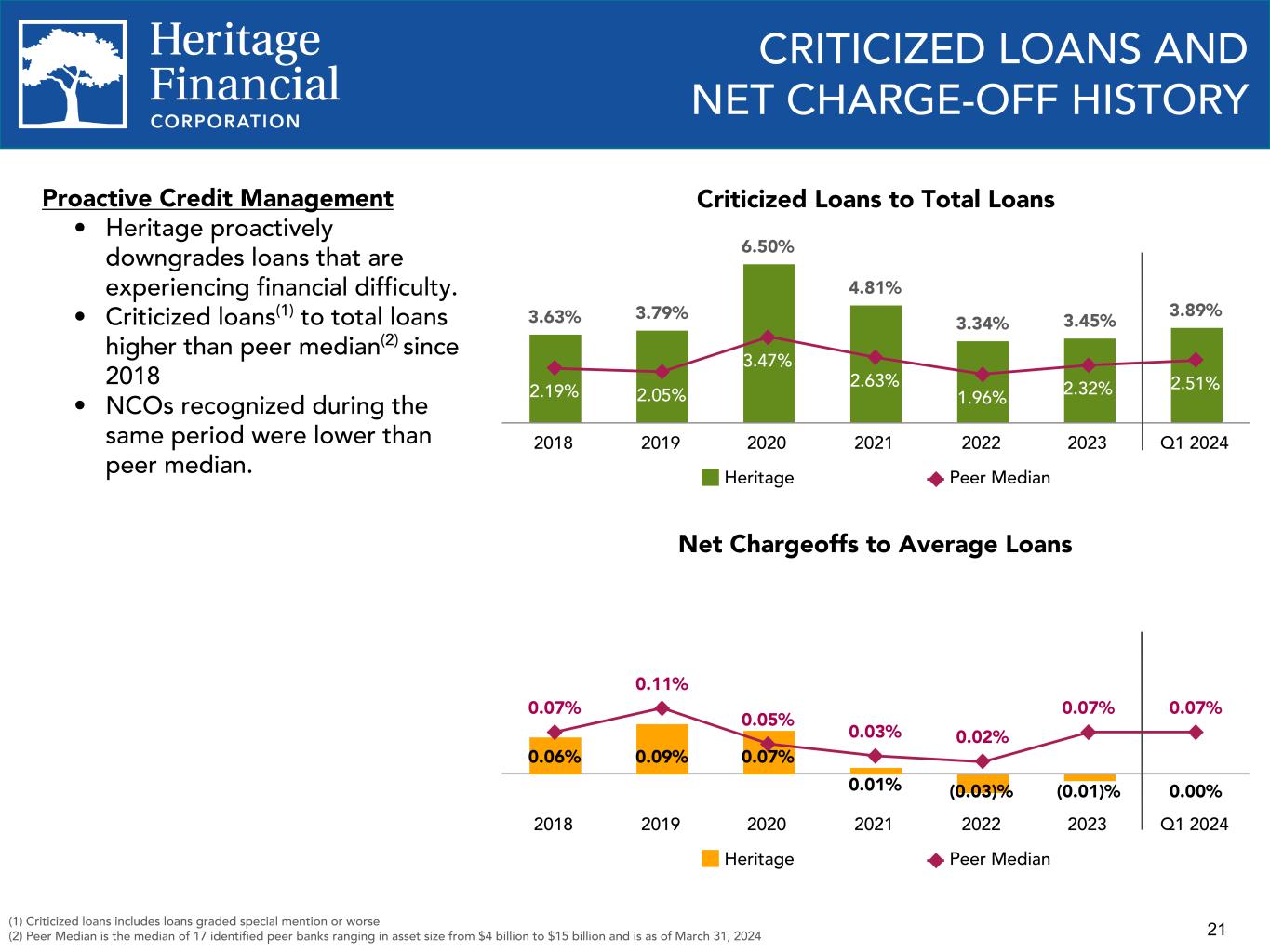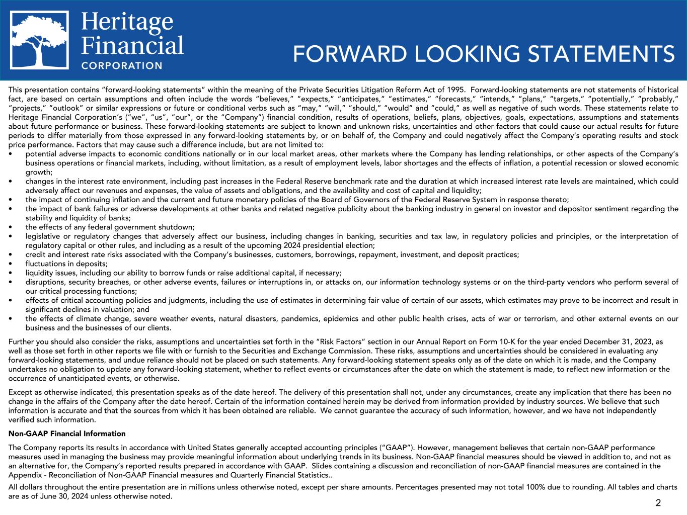 2 This presentation contains “forward-looking statements” within the meaning of the Private Securities Litigation Reform Act of 1995. Forward-looking statements are not statements of historical fact, are based on certain assumptions and often include the words “believes,” “expects,” “anticipates,” “estimates,” “forecasts,” “intends,” “plans,” “targets,” “potentially,” “probably,” “projects,” “outlook” or similar expressions or future or conditional verbs such as “may,” “will,” “should,” “would” and “could,” as well as negative of such words. These statements relate to Heritage Financial Corporation’s (“we”, “us”, “our”, or the “Company”) financial condition, results of operations, beliefs, plans, objectives, goals, expectations, assumptions and statements about future performance or business. These forward-looking statements are subject to known and unknown risks, uncertainties and other factors that could cause our actual results for future periods to differ materially from those expressed in any forward-looking statements by, or on behalf of, the Company and could negatively affect the Company’s operating results and stock price performance. Factors that may cause such a difference include, but are not limited to: • potential adverse impacts to economic conditions nationally or in our local market areas, other markets where the Company has lending relationships, or other aspects of the Company’s business operations or financial markets, including, without limitation, as a result of employment levels, labor shortages and the effects of inflation, a potential recession or slowed economic growth; • changes in the interest rate environment, including past increases in the Federal Reserve benchmark rate and the duration at which increased interest rate levels are maintained, which could adversely affect our revenues and expenses, the value of assets and obligations, and the availability and cost of capital and liquidity; • the impact of continuing inflation and the current and future monetary policies of the Board of Governors of the Federal Reserve System in response thereto; • the impact of bank failures or adverse developments at other banks and related negative publicity about the banking industry in general on investor and depositor sentiment regarding the stability and liquidity of banks; • the effects of any federal government shutdown; • legislative or regulatory changes that adversely affect our business, including changes in banking, securities and tax law, in regulatory policies and principles, or the interpretation of regulatory capital or other rules, and including as a result of the upcoming 2024 presidential election; • credit and interest rate risks associated with the Company’s businesses, customers, borrowings, repayment, investment, and deposit practices; • fluctuations in deposits; • liquidity issues, including our ability to borrow funds or raise additional capital, if necessary; • disruptions, security breaches, or other adverse events, failures or interruptions in, or attacks on, our information technology systems or on the third-party vendors who perform several of our critical processing functions; • effects of critical accounting policies and judgments, including the use of estimates in determining fair value of certain of our assets, which estimates may prove to be incorrect and result in significant declines in valuation; and • the effects of climate change, severe weather events, natural disasters, pandemics, epidemics and other public health crises, acts of war or terrorism, and other external events on our business and the businesses of our clients. Further you should also consider the risks, assumptions and uncertainties set forth in the “Risk Factors” section in our Annual Report on Form 10-K for the year ended December 31, 2023, as well as those set forth in other reports we file with or furnish to the Securities and Exchange Commission. These risks, assumptions and uncertainties should be considered in evaluating any forward-looking statements, and undue reliance should not be placed on such statements. Any forward-looking statement speaks only as of the date on which it is made, and the Company undertakes no obligation to update any forward-looking statement, whether to reflect events or circumstances after the date on which the statement is made, to reflect new information or the occurrence of unanticipated events, or otherwise. Except as otherwise indicated, this presentation speaks as of the date hereof. The delivery of this presentation shall not, under any circumstances, create any implication that there has been no change in the affairs of the Company after the date hereof. Certain of the information contained herein may be derived from information provided by industry sources. We believe that such information is accurate and that the sources from which it has been obtained are reliable. We cannot guarantee the accuracy of such information, however, and we have not independently verified such information. Non-GAAP Financial Information The Company reports its results in accordance with United States generally accepted accounting principles (“GAAP”). However, management believes that certain non-GAAP performance measures used in managing the business may provide meaningful information about underlying trends in its business. Non-GAAP financial measures should be viewed in addition to, and not as an alternative for, the Company’s reported results prepared in accordance with GAAP. Slides containing a discussion and reconciliation of non-GAAP financial measures are contained in the Appendix - Reconciliation of Non-GAAP Financial measures and Quarterly Financial Statistics.. All dollars throughout the entire presentation are in millions unless otherwise noted, except per share amounts. Percentages presented may not total 100% 
