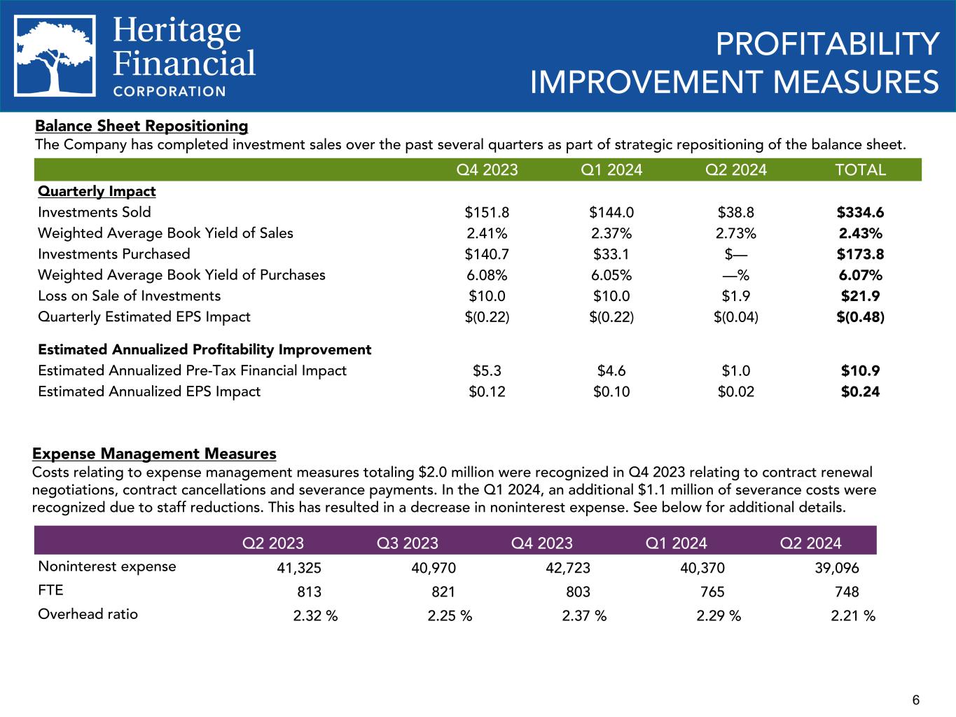 In the second quarter of 2024, the Company incurred a pre-tax loss of $1.9 million on the sale of investment securities due to the strategic repositioning of its balance sheet, which decreased diluted earnings per share by $0.04 for the quarter. The Company sold $38.7 million in investment securities with an estimated weighted average book yield of 2.73%. The proceeds from sales were used to fund loan growth for the quarter.