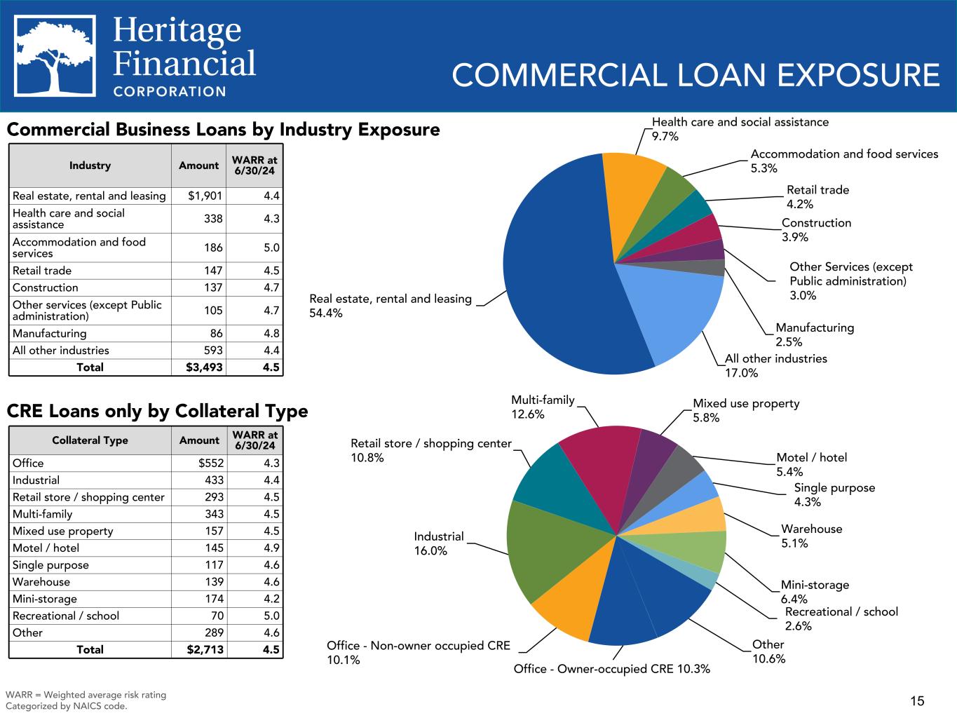 14 Construction Commitments $488 $686 $769 $762 $730 $227 $294 $414 $457 $459 $261 $392 $355 $305 $271 Outstanding Balance Available Credit 2021 2022 2023 Q1 2024 Q2 2024 LOC Utilization Rates 25.2% 29.8% 28.2% 31.9% 30.4% 46.5% 42.9% 53.8% 60.0% 62.9% 31.4% 31.1% 31.1% 31.7% 31.6% Utilization Rate - Consumer LOCs Utilization Rate - Construction LOCs Utilization Rate - C&I LOCs 2021 2022 2023 Q1 2024 Q2 2024 LINE OF CREDIT ("LOC") UTILIZATION