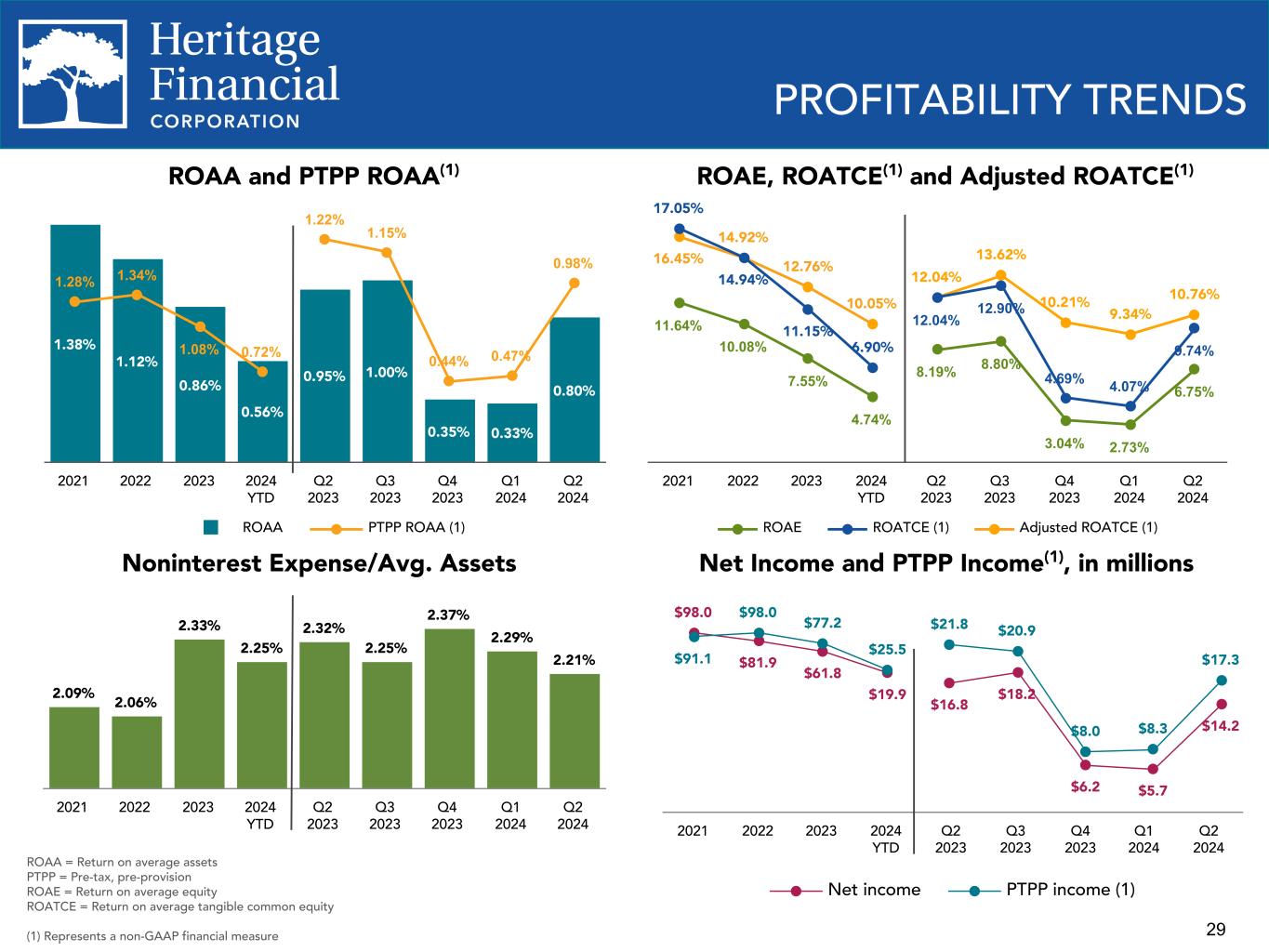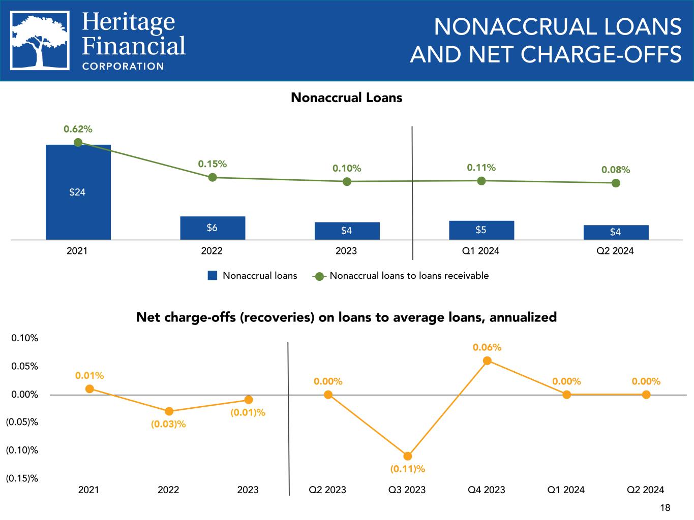 Olympia, WA - Heritage Financial Corporation (Nasdaq GS: HFWA) (the “Company”), the parent company of Heritage Bank (the "Bank"), today reported net income of $14.2 million for the second quarter of 2024 compared to $5.7 million for the first quarter of 2024 and $16.8 million for the second quarter of 2023. Diluted earnings per share for the second quarter of 2024 were $0.41 compared to $0.16 for the first quarter of 2024 and $0.48 for the second quarter of 2023.