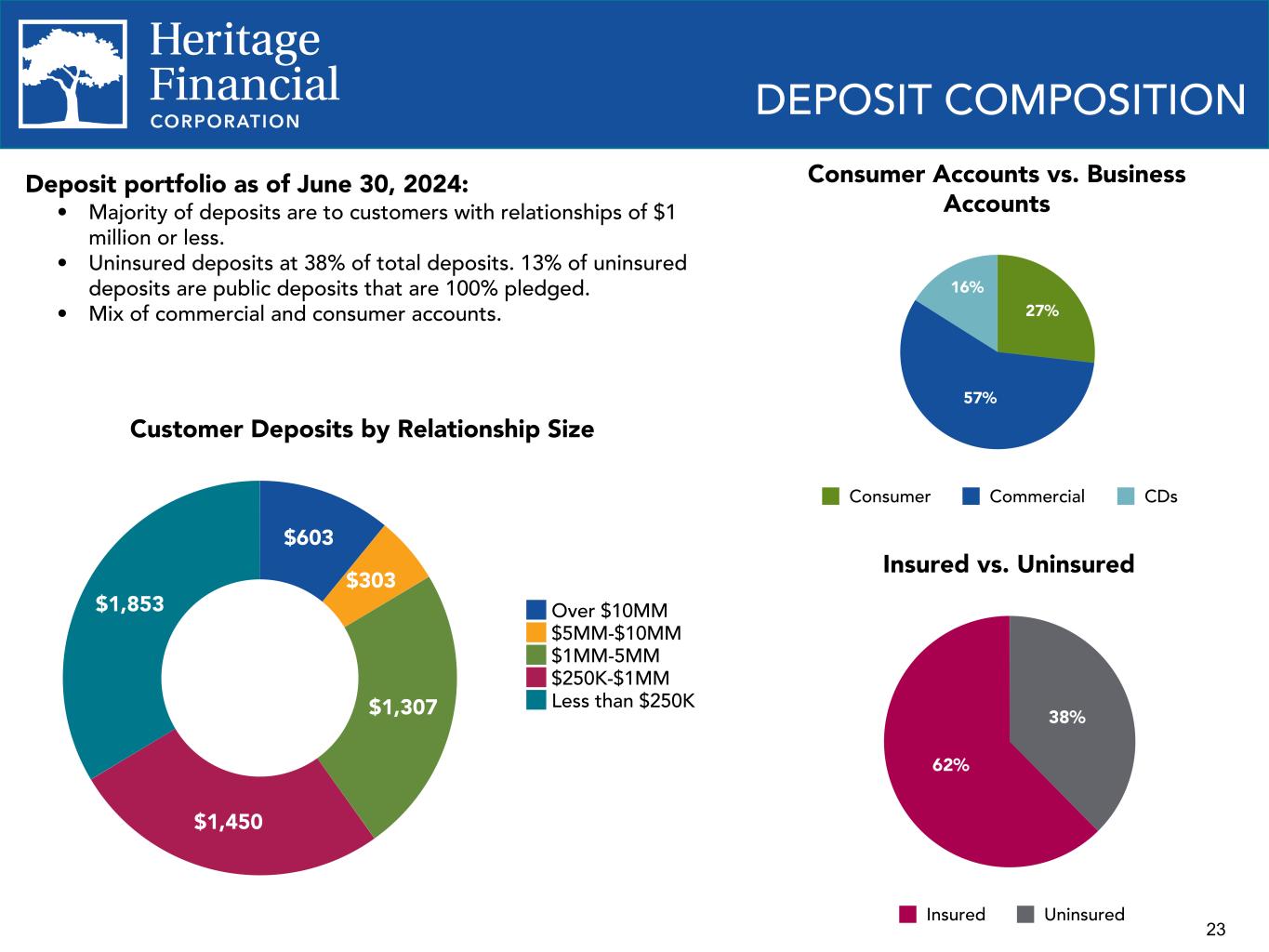 22 Average Deposit Balances and Cost of Total Deposits $6,090 $6,322 $5,706 $5,541 $5,656 $5,701 $5,621 $5,526 $5,555 0.10% 0.11% 0.69% 1.26% 0.61% 0.83% 1.01% 1.19% 1.34% 0.92% 1.23% 1.48% 1.70% 1.89% 0.16% 0.17% 1.03% 1.80% Average deposits Cost of total deposits Cost of int-bearing deposits 2021 2022 2023 2024 YTD Q2 2023 Q3 2023 Q4 2023 Q1 2024 Q2 2024 DEPOSITS Deposit Composition 36.7% 35.5% 30.6% 29.5% 29.0% 30.4% 30.9% 28.7% 28.1% 27.0% 17.5% 17.9% 19.5% 19.9% 19.9% 10.0% 10.5% 8.7% 8.4% 8.1% 5.4% 5.2% 12.4% 14.1% 16.0% Noninterest demand deposits Interest bearing demand deposits Money market accounts Savings accounts Certificates of deposit 2021 2022 2023 Q1 2024 Q2 2024