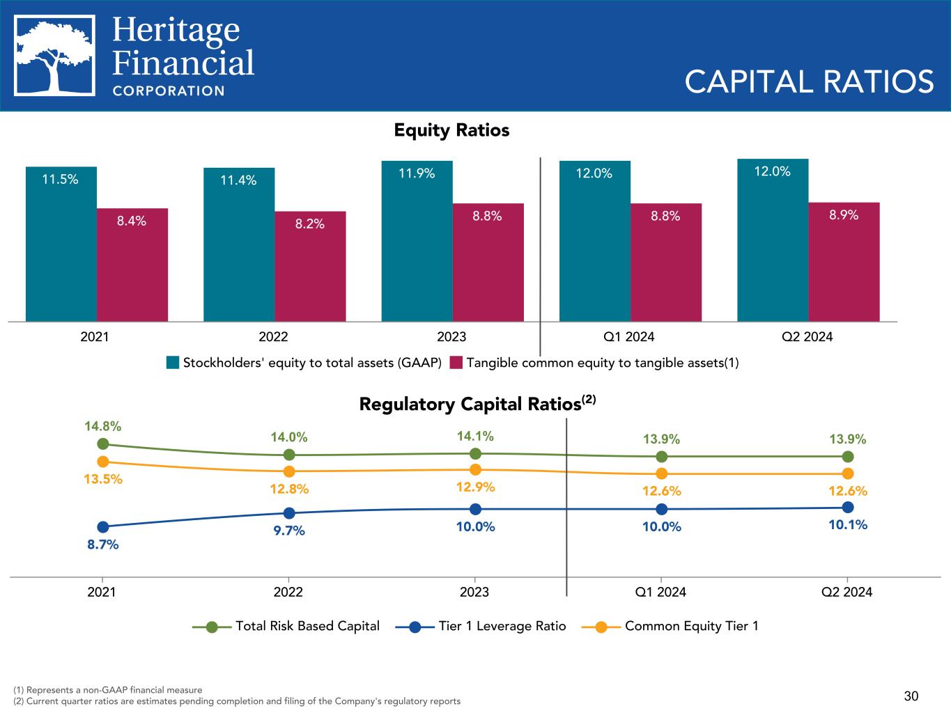29 $98.0 $81.9 $61.8 $19.9 $91.1 $98.0 $77.2 $25.5 Net income PTPP income (1) 2021 2022 2023 2024 YTD Q2 2023 Q3 2023 Q4 2023 Q1 2024 Q2 2024 $16.8 $18.2 $6.2 $5.7 $14.2 $21.8 $20.9 $8.0 $8.3 $17.3 PROFITABILITY TRENDS ROAE, ROATCE(1) and Adjusted ROATCE(1) Noninterest Expense/Avg. Assets ROAA and PTPP ROAA(1) 1.38% 1.12% 0.86% 0.56% 0.95% 1.00% 0.35% 0.33% 0.80% 1.28% 1.34% 1.08% 0.72% 1.22% 1.15% 0.44% 0.47% 0.98% ROAA PTPP ROAA (1) 2021 2022 2023 2024 YTD Q2 2023 Q3 2023 Q4 2023 Q1 2024 Q2 2024 Net Income and PTPP Income(1), in millions 16.45% 14.92% 12.76% 10.05% 12.04% 13.62% 10.21% 9.34% 10.76% 17.05% 14.94% 11.15% 6.90% 12.04% 12.90% 4.69% 4.07% 9.74% 11.64% 10.08% 7.55% 4.74% 8.19% 8.80% 3.04% 2.73% 6.75% ROAE ROATCE (1) Adjusted ROATCE (1) 2021 2022 2023 2024 YTD Q2 2023 Q3 2023 Q4 2023 Q1 2024 Q2 2024 2.09% 2.06% 2.33% 2.25% 2.32% 2.25% 2.37% 2.29% 2.21% 2021 2022 2023 2024 YTD Q2 2023 Q3 2023 Q4 2023 Q1 2024 Q2 2024 ROAA = Return on average assets PTPP = Pre-tax, pre-provision ROAE = Return on average equity ROATCE = Return on average tangible common equity (1) Represents a non-GAAP financial measure