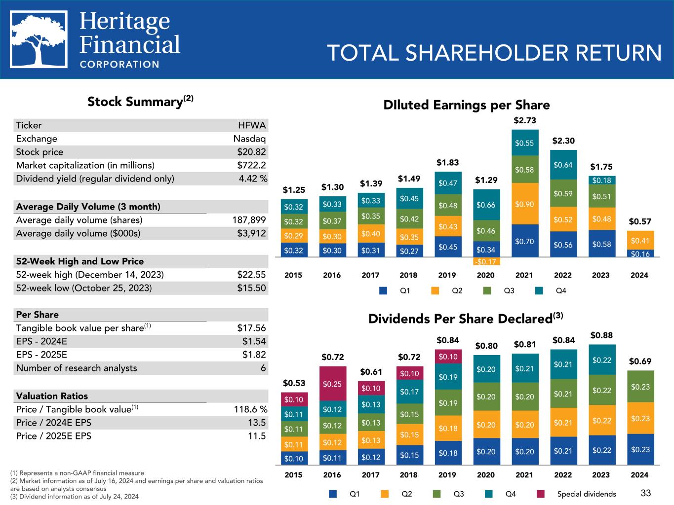 33 TOTAL SHAREHOLDER RETURN Stock Summary(2) Ticker HFWA Exchange Nasdaq Stock price $20.82 Market capitalization (in millions) $722.2 Dividend yield (regular dividend only) 4.42 % Average Daily Volume (3 month) Average daily volume (shares) 187,899 Average daily volume ($000s) $3,912 52-Week High and Low Price 52-week high (December 14, 2023) $22.55 52-week low (October 25, 2023) $15.50 Per Share Tangible book value per share(1) $17.56 EPS - 2024E $1.54 EPS - 2025E $1.82 Number of research analysts 6 Valuation Ratios Price / Tangible book value(1) 118.6 % Price / 2024E EPS 13.5 Price / 2025E EPS 11.5 Dividends Per Share Declared(3) $0.53 $0.72 $0.61 $0.72 $0.84 $0.80 $0.81 $0.84 $0.88 $0.69 $0.10 $0.11 $0.12 $0.15 $0.18 $0.20 $0.20 $0.21 $0.22 $0.23 $0.11 $0.12 $0.13 $0.15 $0.18 $0.20 $0.20 $0.21 $0.22 $0.23 $0.11 $0.12 $0.13 $0.15 $0.19 $0.20 $0.20 $0.21 $0.22 $0.23 $0.11 $0.12 $0.13 $0.17 $0.19 $0.20 $0.21 $0.21 $0.22 $0.10 $0.25 $0.10 $0.10 $0.10 Q1 Q2 Q3 Q4 Special dividends 2015 2016 2017 2018 2019 2020 2021 2022 2023 2024(1) Represents a non-GAAP financial measure (2) Market information as of July 16, 2024 and earnings per share and valuation ratios are based on analysts consensus (3) Dividend information as of July 24, 2024 DIluted Earnings per Share $1.25 $1.30 $1.39 $1.49 $1.83 $1.29 $2.73 $2.30 $1.75 $0.57 $0.32 $0.30 $0.31 $0.27 $0.45 $0.34 $0.70 $0.56 $0.58 $0.16 $0.29 $0.30 $0.40 $0.35 $0.43 -$0.17 $0.90 $0.52 $0.48 $0.41 $0.32 $0.37 $0.35 $0.42 $0.48 $0.46 $0.58 $0.59 $0.51 $0.32 $0.33 $0.33 $0.45 $0.47 $0.66 $0.55 $0.64 $0.18 Q1 Q2 Q3 Q4 2015 2016 2017 2018 2019 2020 2021 2022 2023 2024