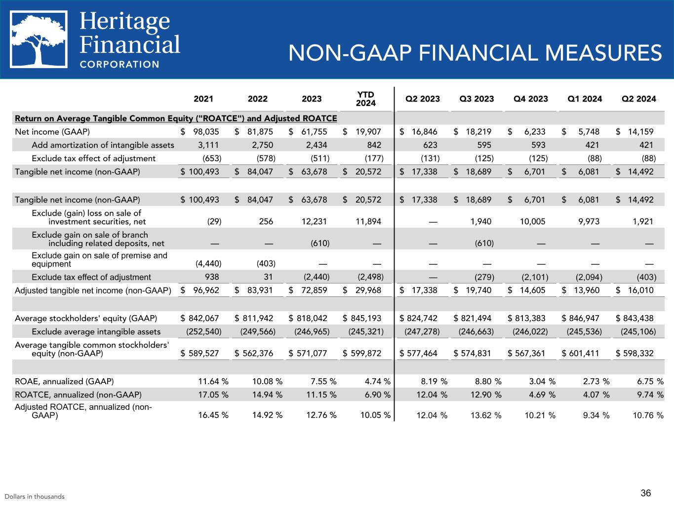 35 NON-GAAP FINANCIAL MEASURES Q2 2023 Q3 2023 Q4 2023 Q1 2024 Q2 2024 Efficiency Ratio and Adjusted Efficiency Ratio Total noninterest expense (GAAP) $ 41,325 $ 40,970 $ 42,723 $ 40,370 $ 39,096 Net interest income (GAAP) $ 55,824 $ 55,618 $ 53,871 $ 51,530 $ 51,113 Total noninterest income (GAAP) $ 7,281 $ 6,271 $ (3,147) $ (2,900) $ 5,246 Exclude (gain) loss on sale of investment securities, net — 1,940 10,005 9,973 1,921 Exclude gain on sale of branch including related deposits, net — (610) — — — Adjusted total non interest income (non-GAAP) $ 7,281 $ 7,601 $ 6,858 $ 7,073 $ 7,167 Efficiency ratio (GAAP) 65.49 % 66.20 % 84.23 % 83.01 % 69.37 % Adjusted efficiency ratio (non-GAAP) 65.49 % 64.81 % 70.35 % 68.89 % 67.08 % Dollars in thousands 2021 2022 2023 YTD 2024 Q2 2023 Q3 2023 Q4 2023 Q1 2024 Q2 2024 Pretax Preprovision ("PTPP") Income and PTPP Return on Average Assets ("ROAA"): Net income (GAAP) $ 98,035 $ 81,875 $ 61,755 $ 19,907 $ 16,846 $ 18,219 $ 6,233 $ 5,748 $ 14,159 Exclude income tax expense 22,472 17,561 11,160 2,956 3,025 3,578 344 1,120 1,836 Exclude provision for (reversal of provision for) credit losses (29,372) (1,426) 4,280 2,660 1,909 (878) 1,424 1,392 1,268 PTPP income (non-GAAP) $ 91,135 $ 98,010 $ 77,195 $ 25,523 $ 21,780 $ 20,919 $ 8,001 $ 8,260 $ 17,263 Average total assets $ 7,126,250 $ 7,321,455 $ 7,140,024 $ 7,099,621 $7,142,865 $7,212,732 $7,140,876 $7,092,452 $7,106,791 ROAA, annualized (GAAP) 1.38 % 1.12 % 0.86 % 0.56 % 0.95 % 1.00 % 0.35 % 0.33 % 0.80 % PTPP ROAA, annualized (non-GAAP) 1.28 % 1.34 % 1.08 % 0.72 % 1.22 % 1.15 % 0.44 % 0.47 % 0.98 %