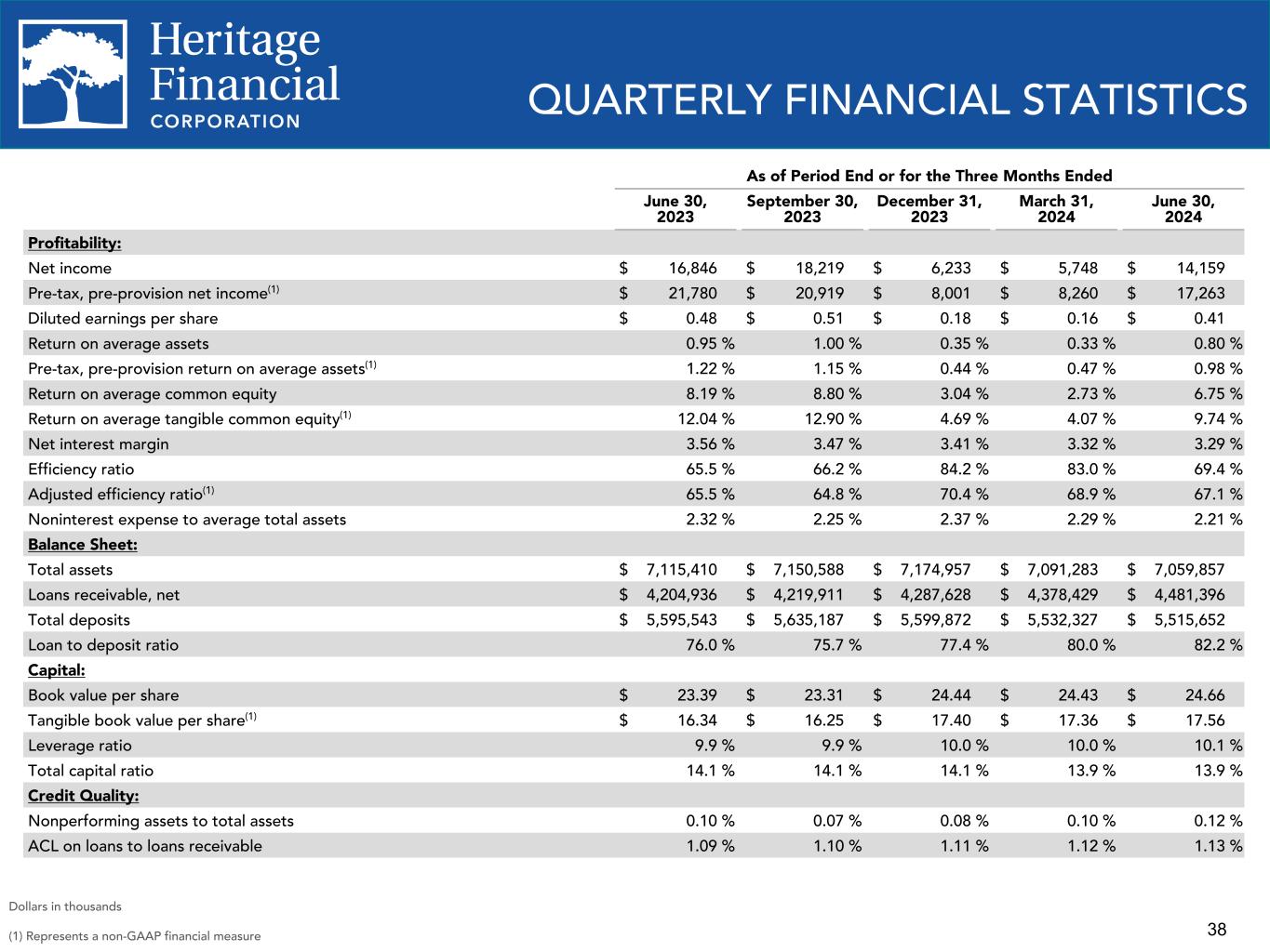 37 2014 2015 2016 2017 2018 2019 2020 2022 2023 Tangible Book Value Per Share: Total stockholders' equity (GAAP) $ 454,506 $ 469,970 $ 481,763 $ 505,305 $ 760,723 $ 809,311 $ 820,439 $ 797,893 $ 853,261 Exclude intangible assets (129,918) (127,818) (126,403) (125,117) (261,553) (257,552) (254,027) (248,166) (245,732) Tangible common equity (non-GAAP) $ 324,588 $ 342,152 $ 355,360 $ 380,188 $ 499,170 $ 551,759 $ 566,412 $ 549,727 $ 607,529 Shares outstanding 30,259,838 29,975,439 29,954,931 29,927,746 36,874,055 36,618,729 35,912,243 35,106,697 34,906,233 Book value per share (GAAP) $ 15.02 $ 15.68 $ 16.08 $ 16.88 $ 20.63 $ 22.10 $ 22.85 $ 22.73 $ 24.44 Tangible book value per share (non-GAAP) $ 10.73 $ 11.41 $ 11.86 $ 12.70 $ 13.54 $ 15.07 $ 15.77 $ 15.66 $ 17.40 Moved to 2nd slide Tangible Book Value Per Share (cont'd): 2024 Q1 Q2 Total stockholders' equity (GAAP) $ 847,580 $ 850,507 Exclude intangible assets (245,311) (244,890) Tangible common equity (non-GAAP) $ 602,269 $ 605,617 Shares outstanding 34,689,843 34,496,197 Book value per share (GAAP) $ 24.43 $ 24.66 Tangible book value per share (non-GAAP) $ 17.36 $ 17.56 NON-GAAP FINANCIAL MEASURES Dollars in thousands
