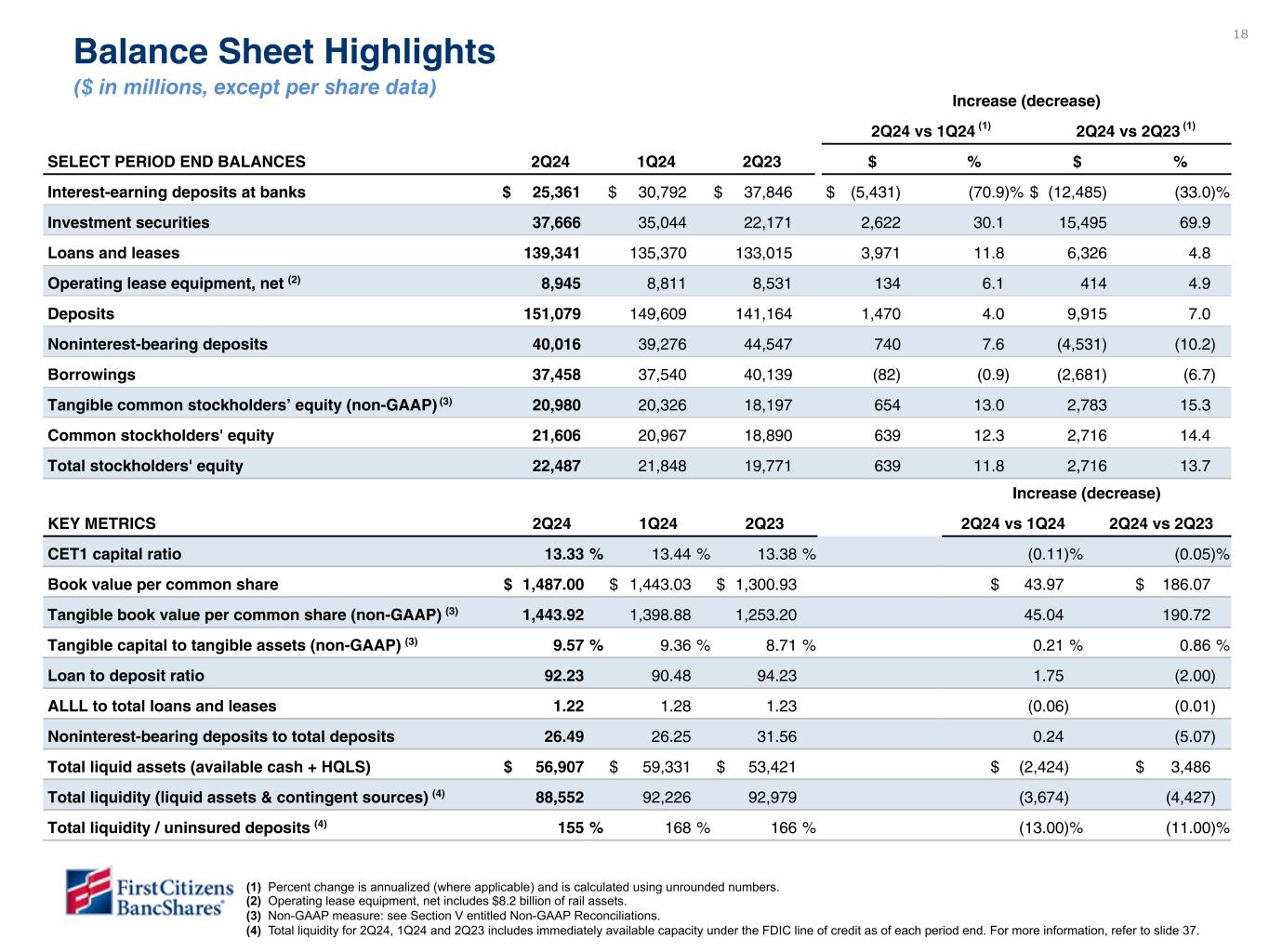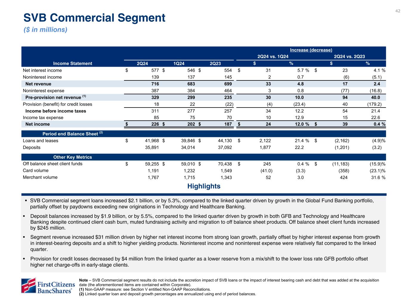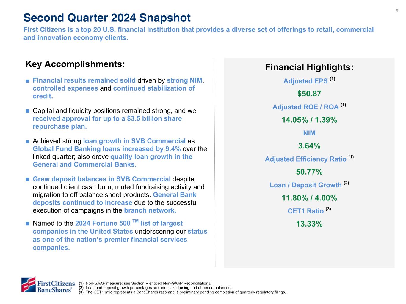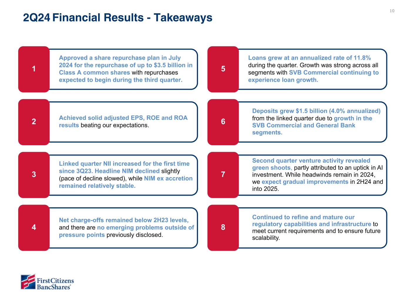 Chairman and CEO Frank B. Holding, Jr. said: “We are pleased with our second quarter financial results, which reflected broad-based loan and deposit growth, strong profitability metrics and continued stabilization of credit. These results reflected the solid performance from all of our business segments and we were encouraged by the continued progress in our SVB Commercial segment, which achieved both loan and deposit growth. In addition, we are pleased to announce that our Board of Directors approved a share repurchase plan for the repurchase of up to $3.5 billion of our Class A common shares, with repurchases expected to begin during the third quarter of 2024.”