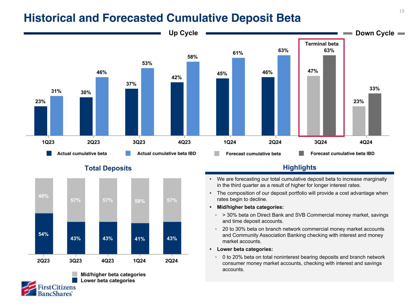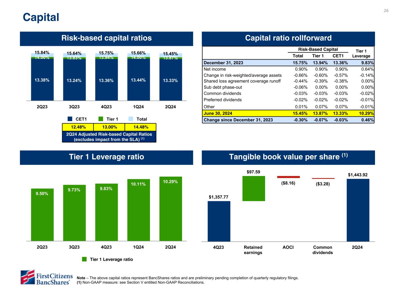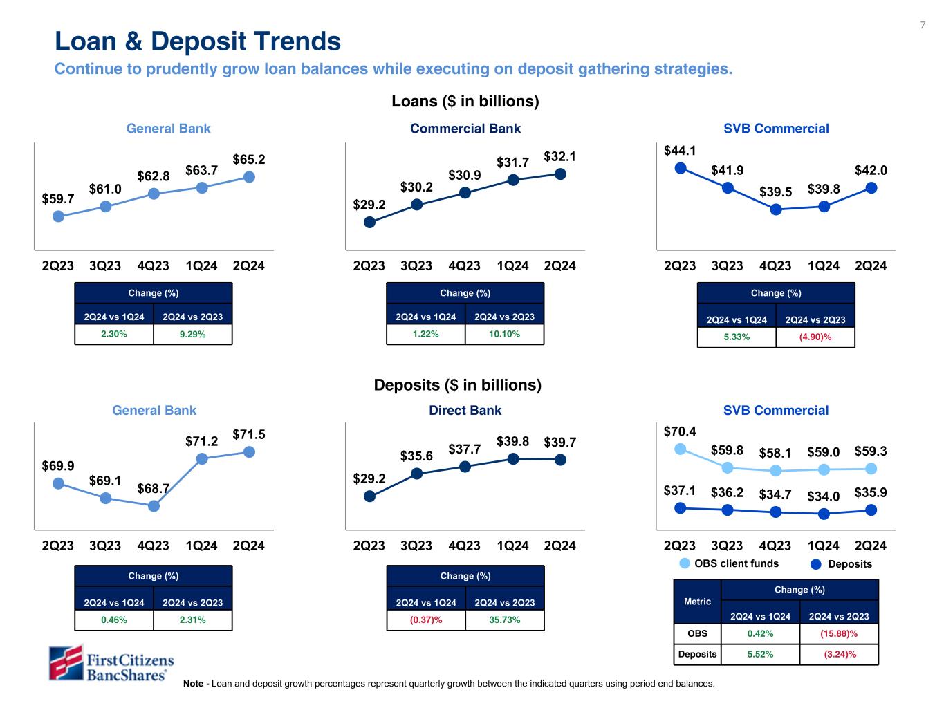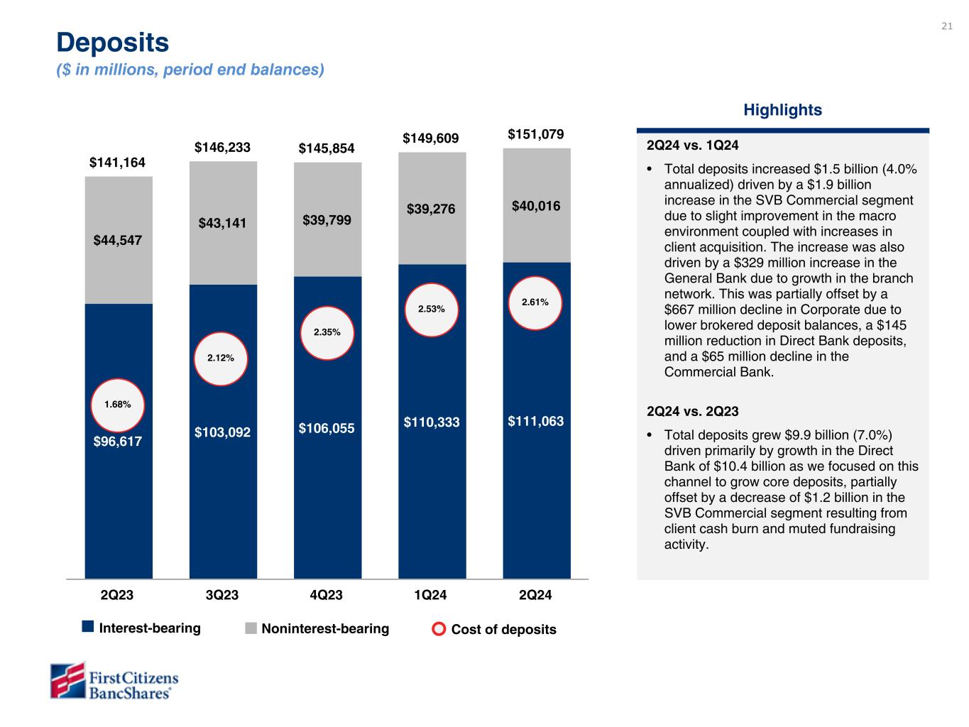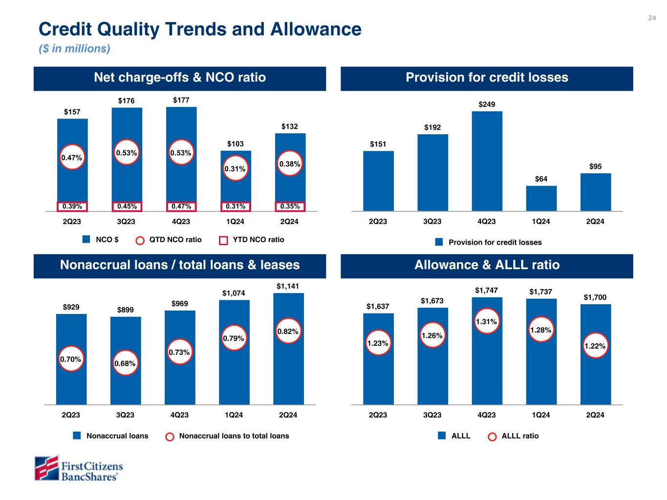 Chairman and CEO Frank B. Holding, Jr. said: “We are pleased with our second quarter financial results, which reflected broad-based loan and deposit growth, strong profitability metrics and continued stabilization of credit. These results reflected the solid performance from all of our business segments and we were encouraged by the continued progress in our SVB Commercial segment, which achieved both loan and deposit growth. In addition, we are pleased to announce that our Board of Directors approved a share repurchase plan for the repurchase of up to $3.5 billion of our Class A common shares, with repurchases expected to begin during the third quarter of 2024.”
