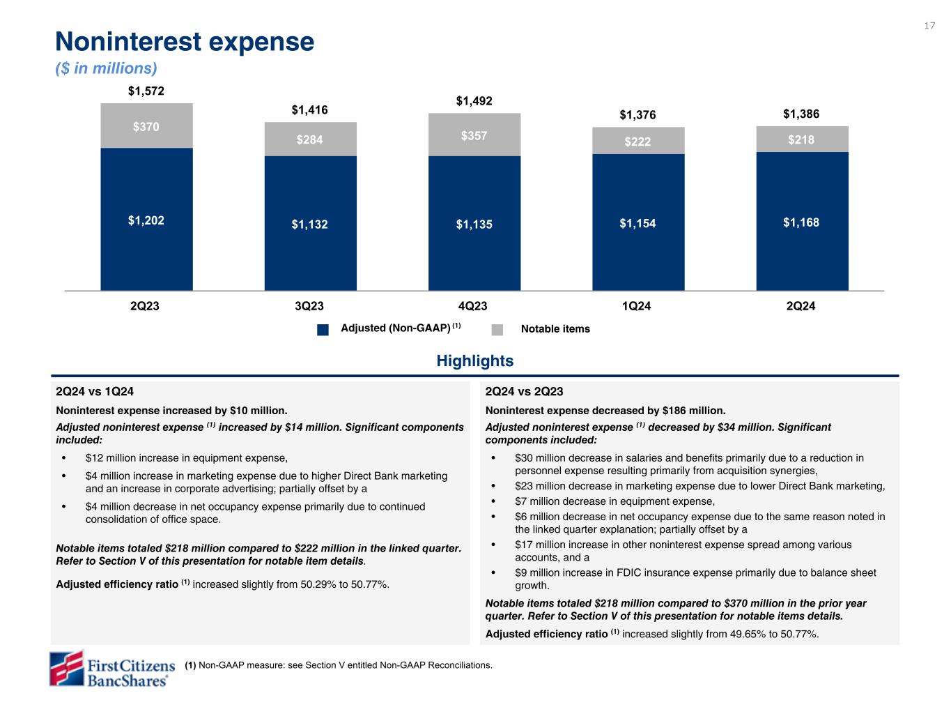 •Adjusted noninterest expense was $1.17 billion compared to $1.15 billion in the linked quarter. The increase of $14 million was mainly due to higher equipment expense related to increased software maintenance and rent.