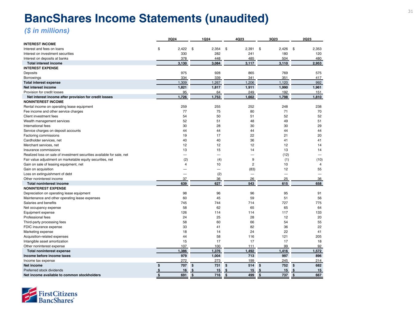 Net income for the second quarter of 2024 (“current quarter”) was $707 million compared to $731 million for the first quarter of 2024 (“linked quarter”). Net income available to common stockholders for the current quarter was $691 million, or $47.54 per diluted common share, a $25 million decrease from $716 million, or $49.26 per diluted common share, in the linked quarter.