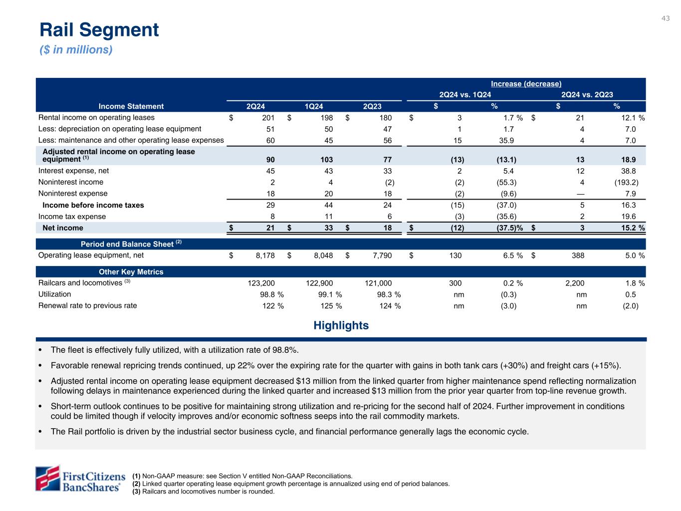 •Adjusted noninterest income was $479 million compared to $478 million in the linked quarter, an increase of $1 million. The previously discussed increases in noninterest income were offset by a decline of $13 million in adjusted rental income on operating lease equipment, primarily related to higher maintenance and other operating lease expenses.