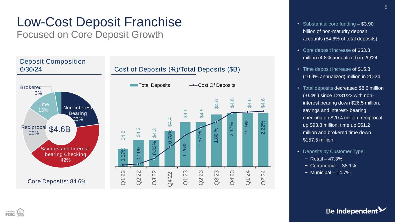 2Q’24 Overview • Total loans increased 1.2% annualized while maintaining conservative approach to new loan production • New loan production continues to be largely focused on new commercial clients that bring deposits to the bank • Asset quality remained exceptional with NPAs/Total Assets at 0. 10% and NCO of 0.02% of average loans in the quarter • Core deposit growth of $53.3 million (excluding brokered deposits) • Brokered deposit balances decreased $21.3 million • Continued rotation into higher yielding assets contributed to net interest margin increasing to 3.40% • Continued high level of profitability with ROAA of 1.44% • Achieved growth in all capital ratios for the quarter • Tangible book value per share increased 3.9% from end of prior quarter • Balance sheet liquidity remains strong with loan-to-deposit ratio of 83% • Net income of $18.5 million, or $0.88 per diluted share • Increases in net income and diluted earnings per share of 25.3% and 25.7% respectively over, prior year quarter • Strong profitability and prudent balance sheet management results in further growth in tangible book value per share Healthy Capital & Liquidity Positions Positive Trends in Key Metrics Solid Loan Growth and Strong Asset Quality 2Q'24 Earnings 4 4