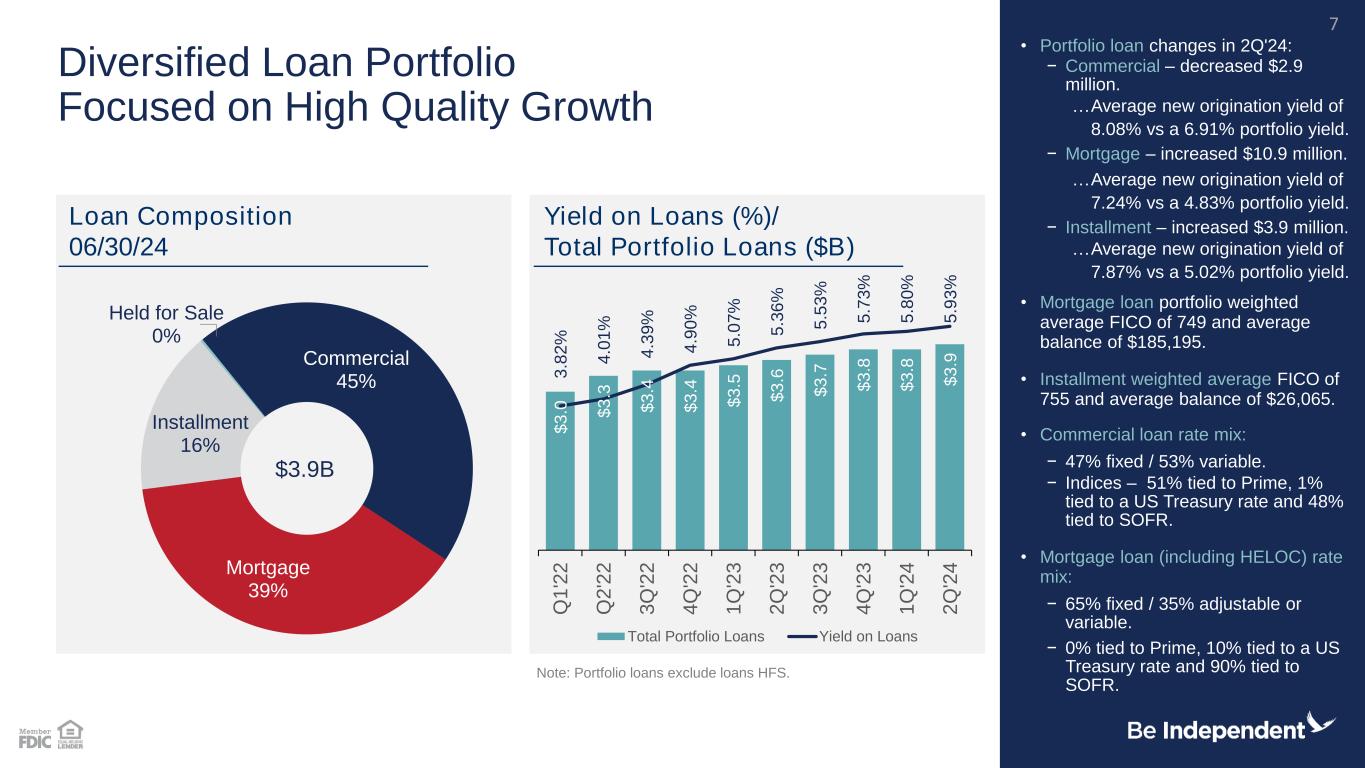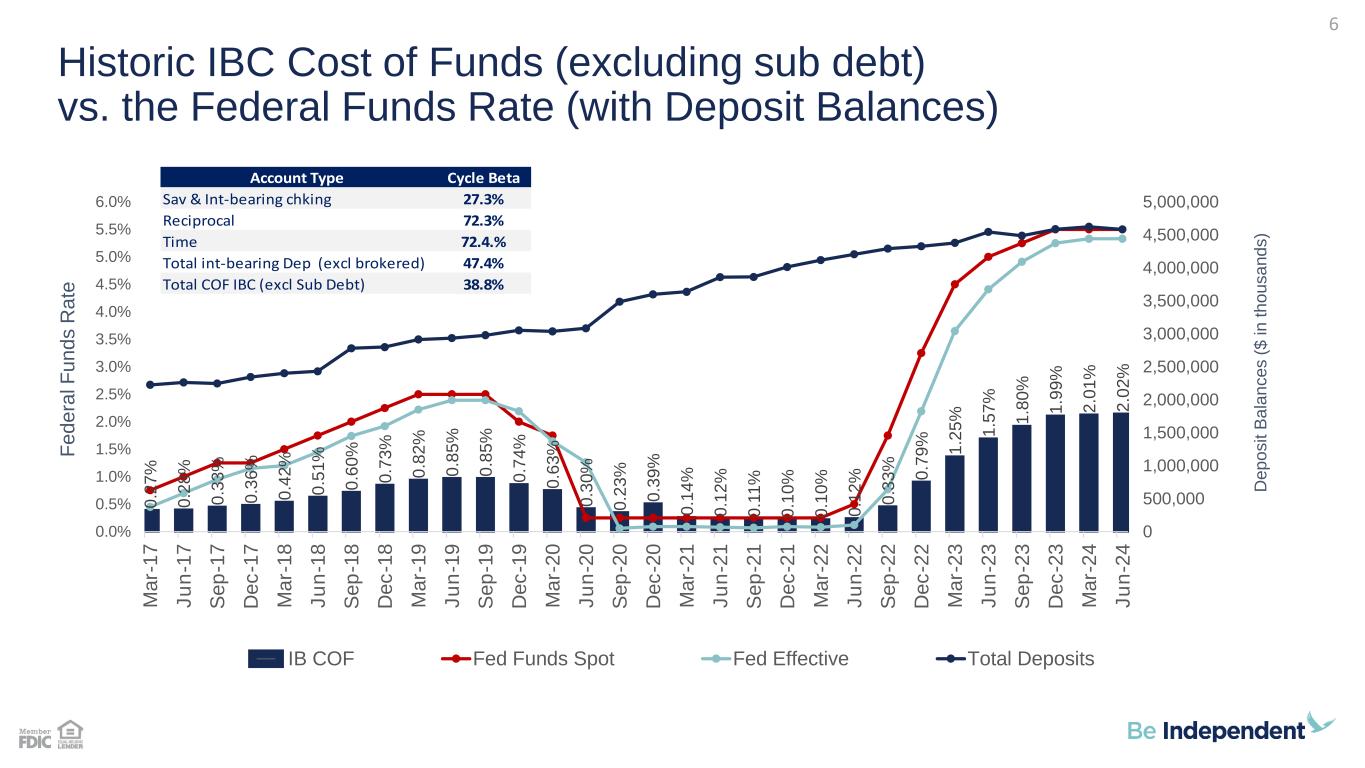 0 .2 7 % 0 .2 8 % 0 .3 3 % 0 .3 6 % 0 .4 2 % 0 .5 1 % 0 .6 0 % 0 .7 3 % 0 .8 2 % 0 .8 5 % 0 .8 5 % 0 .7 4 % 0 .6 3 % 0 .3 0 % 0 .2 3 % 0 .3 9 % 0 .1 4 % 0 .1 2 % 0 .1 1 % 0 .1 0 % 0 .1 0 % 0 .1 2 % 0 .3 3 % 0 .7 9 % 1 .2 5 % 1 .5 7 % 1 .8 0 % 1 .9 9 % 2 .0 1 % 2 .0 2 % 0 500,000 1,000,000 1,500,000 2,000,000 2,500,000 3,000,000 3,500,000 4,000,000 4,500,000 5,000,000 0.0% 0.5% 1.0% 1.5% 2.0% 2.5% 3.0% 3.5% 4.0% 4.5% 5.0% 5.5% 6.0% M a r- 1 7 J u n -1 7 S e p -1 7 D e c -1 7 M a r- 1 8 J u n -1 8 S e p -1 8 D e c -1 8 M a r- 1 9 J u n -1 9 S e p -1 9 D e c -1 9 M a r- 2 0 J u n -2 0 S e p -2 0 D e c -2 0 M a r- 2 1 J u n -2 1 S e p -2 1 D e c -2 1 M a r- 2 2 J u n -2 2 S e p -2 2 D e c -2 2 M a r- 2 3 J u n -2 3 S e p -2 3 D e c -2 3 M a r- 2 4 J u n -2 4 IB COF Fed Funds Spot Fed Effective Total Deposits Historic IBC Cost of Funds (excluding sub debt) vs. the Federal Funds Rate (with Deposit Balances) D e p o s it B a la n c e s ( $ i n t h o u s a n d s ) 6 F e d e ra l F u n d s R a te Account Type Cycle Beta Sav & Int-bearing chking 27.3% Reciprocal 72.3% Time 72.4.% Total int-bearing Dep (excl brokered) 47.4% Total COF IBC (excl Sub Debt) 38.8%