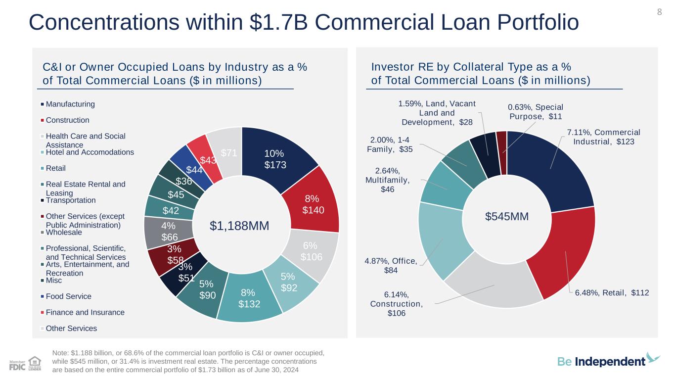 Commercial 45% Mortgage 39% Installment 16% Held for Sale 0% $ 3 .0 $ 3 .3 $ 3 .4 $ 3 .4 $ 3 .5 $ 3 .6 $ 3 .7 $ 3 .8 $ 3 .8 $ 3 .9 3 .8 2 % 4 .0 1 % 4 .3 9 % 4 .9 0 % 5 .0 7 % 5 .3 6 % 5 .5 3 % 5 .7 3 % 5 .8 0 % 5 .9 3 % Q 1 '2 2 Q 2 '2 2 3 Q '2 2 4 Q '2 2 1 Q '2 3 2 Q '2 3 3 Q '2 3 4 Q '2 3 1 Q '2 4 2 Q '2 4 Total Portfolio Loans Yield on Loans Diversified Loan Portfolio Focused on High Quality Growth • Portfolio loan changes in 2Q'24: − Commercial – decreased $2.9 million. …Average new origination yield of 8.08% vs a 6.91% portfolio yield. − Mortgage – increased $10.9 million. …Average new origination yield of 7.24% vs a 4.83% portfolio yield. − Installment – increased $3.9 million. …Average new origination yield of 7.87% vs a 5.02% portfolio yield. • Mortgage loan portfolio weighted average FICO of 749 and average balance of $185,195. • Installment weighted average FICO of 755 and average balance of $26,065. • Commercial loan rate mix: − 47% fixed / 53% variable. − Indices – 51% tied to Prime, 1% tied to a US Treasury rate and 48% tied to SOFR. • Mortgage loan (including HELOC) rate mix: − 65% fixed / 35% adjustable or variable. − 0% tied to Prime, 10% tied to a US Treasury rate and 90% tied to SOFR. Note: Portfolio loans exclude loans HFS. Loan Composition 06/30/24 Yield on Loans (%)/ Total Portfolio Loans ($B) 7 $3.9B