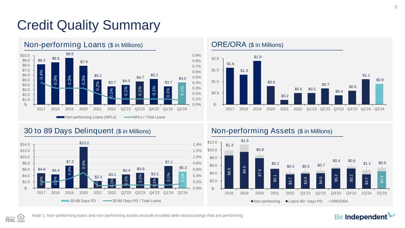 10% $173 8% $140 6% $106 5% $92 8% $132 5% $90 3% $51 3% $58 4% $66 $42 $45 $36 $44 $43 $71 $1,188MM Manufacturing Construction Health Care and Social Assistance Hotel and Accomodations Retail Real Estate Rental and Leasing Transportation Other Services (except Public Administration) Wholesale Professional, Scientific, and Technical Services Arts, Entertainment, and Recreation Misc Food Service Finance and Insurance Other Services Concentrations within $1.7B Commercial Loan Portfolio C&I or Owner Occupied Loans by Industry as a % of Total Commercial Loans ($ in millions) Investor RE by Collateral Type as a % of Total Commercial Loans ($ in millions) $545MM Note: $1.188 billion, or 68.6% of the commercial loan portfolio is C&I or owner occupied, while $545 million, or 31.4% is investment real estate. The percentage concentrations are based on the entire commercial portfolio of $1.73 billion as of June 30, 2024 8 7.11%, Commercial Industrial, $123 6.48%, Retail, $112 6.14%, Construction, $106 4.87%, Office, $84 2.64%, Multifamily, $46 2.00%, 1-4 Family, $35 1.59%, Land, Vacant Land and Development, $28 0.63%, Special Purpose, $11