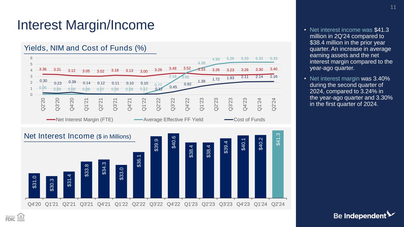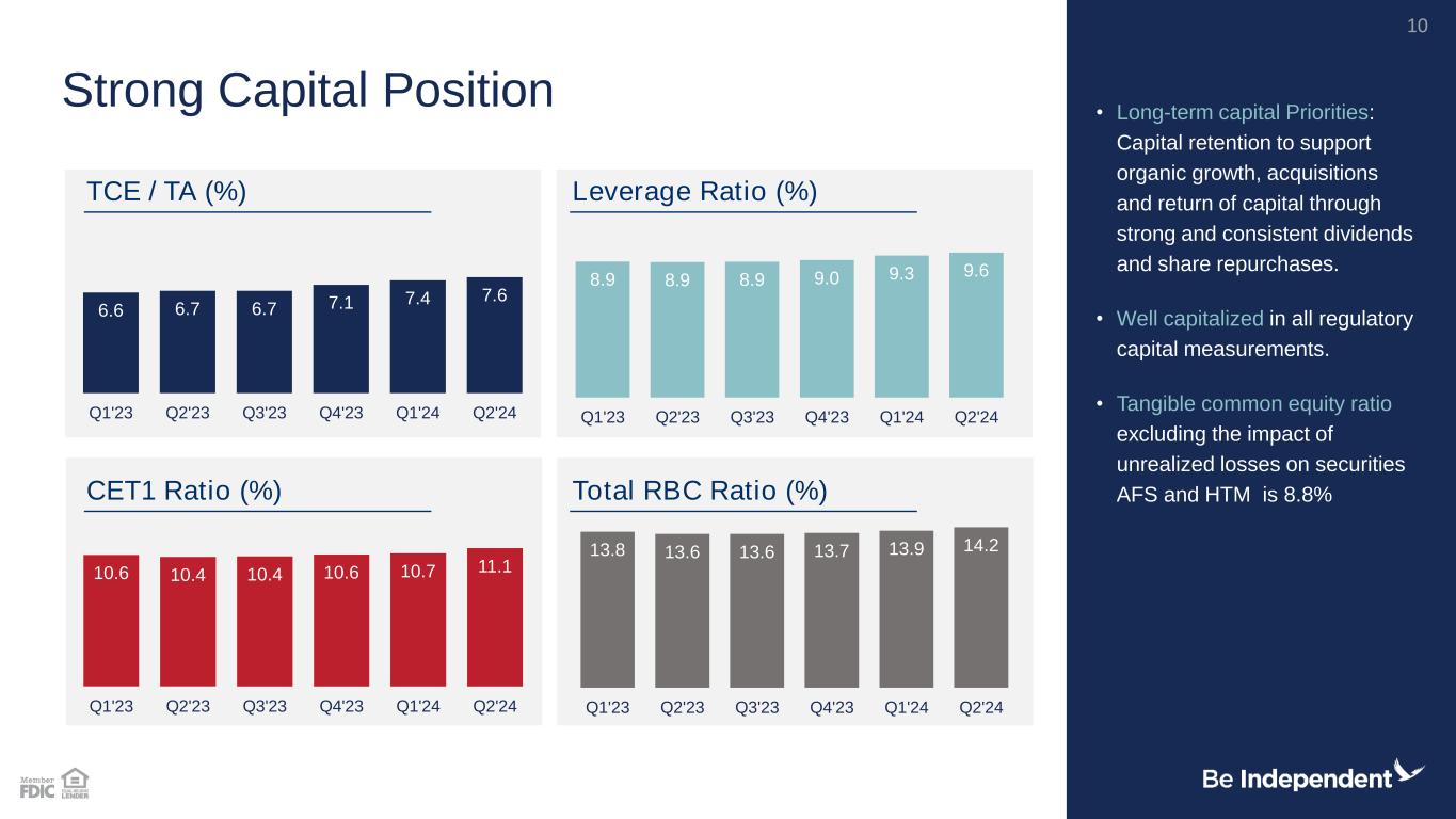 13.8 13.6 13.6 13.7 13.9 14.2 Q1'23 Q2'23 Q3'23 Q4'23 Q1'24 Q2'24 10.6 10.4 10.4 10.6 10.7 11.1 Q1'23 Q2'23 Q3'23 Q4'23 Q1'24 Q2'24 8.9 8.9 8.9 9.0 9.3 9.6 Q1'23 Q2'23 Q3'23 Q4'23 Q1'24 Q2'24 6.6 6.7 6.7 7.1 7.4 7.6 Q1'23 Q2'23 Q3'23 Q4'23 Q1'24 Q2'24 • Long-term capital Priorities: Capital retention to support organic growth, acquisitions and return of capital through strong and consistent dividends and share repurchases. • Well capitalized in all regulatory capital measurements. • Tangible common equity ratio excluding the impact of unrealized losses on securities AFS and HTM is 8.8% Strong Capital Position TCE / TA (%) Leverage Ratio (%) CET1 Ratio (%) Total RBC Ratio (%) 10