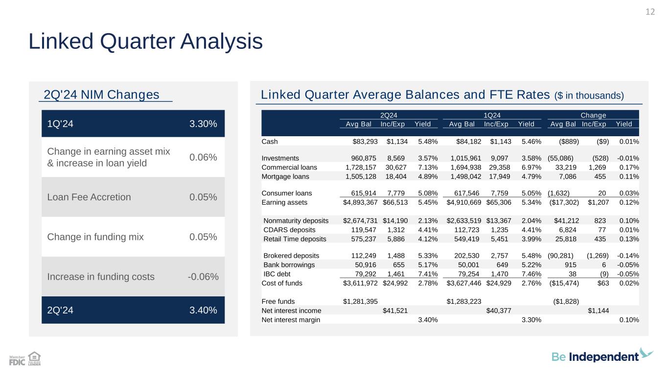 $ 3 1 .0 $ 3 0 .3 $ 3 1 .4 $ 3 3 .8 $ 3 4 .3 $ 3 3 .0 $ 3 6 .1 $ 3 9 .9 $ 4 0 .6 $ 3 8 .4 $ 3 8 .4 $ 3 9 .4 $ 4 0 .1 $ 4 0 .2 $ 4 1 .3 Q4'20 Q1'21 Q2'21 Q3'21 Q4'21 Q1'22 Q2'22 Q3'22 Q4'22 Q1'23 Q2'23 Q3'23 Q4'23 Q1'24 Q2'24 3.36 3.31 3.12 3.05 3.02 3.18 3.13 3.00 3.26 3.49 3.52 3.33 3.26 3.23 3.26 3.30 3.40 0.06 0.09 0.09 0.08 0.07 0.08 0.08 0.12 0.77 2.18 3.65 4.38 4.99 5.26 5.33 5.33 5.33 0.30 0.23 0.39 0.14 0.12 0.11 0.10 0.10 0.12 0.45 0.92 1.39 1.72 1.93 2.11 2.14 2.16 0 1 2 3 4 5 6 Q 2 '2 0 Q 3 '2 0 Q 4 '2 0 Q 1 '2 1 Q 2 '2 1 Q 3 '2 1 Q 4 '2 1 Q 1 '2 2 Q 2 '2 2 Q 3 '2 2 Q 4 '2 2 Q 1 '2 3 Q 2 '2 3 Q 3 '2 3 Q 4 '2 3 Q 1 '2 4 Q 2 '2 4 Net Interest Margin (FTE) Average Effective FF Yield Cost of Funds Net Interest Margin/Income • Net interest income was $41.3 million in 2Q'24 compared to $38.4 million in the prior year quarter. An increase in average earning assets and the net interest margin compared to the year-ago quarter. • Net interest margin was 3.40% during the second quarter of 2024, compared to 3.24% in the year-ago quarter and 3.30% in the first quarter of 2024. Yields, NIM and Cost of Funds (%) Net Interest Income ($ in Millions) 11