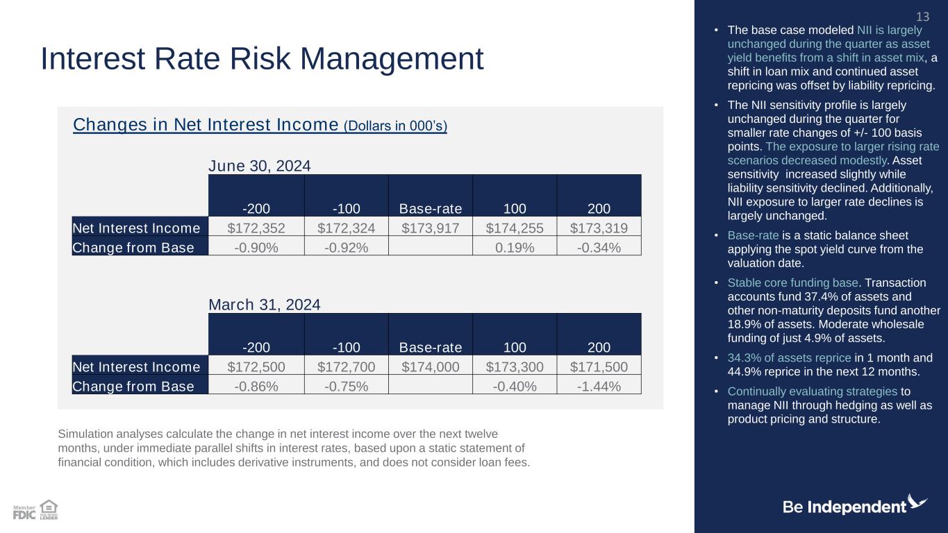 1Q'24 3.30% Change in earning asset mix & increase in loan yield 0.06% Loan Fee Accretion 0.05% Change in funding mix 0.05% Increase in funding costs -0.06% 2Q'24 3.40% 2Q24 1Q24 Change Avg Bal Inc/Exp Yield Avg Bal Inc/Exp Yield Avg Bal Inc/Exp Yield Cash $83,293 $1,134 5.48% $84,182 $1,143 5.46% ($889) ($9) 0.01% Investments 960,875 8,569 3.57% 1,015,961 9,097 3.58% (55,086) (528) -0.01% Commercial loans 1,728,157 30,627 7.13% 1,694,938 29,358 6.97% 33,219 1,269 0.17% Mortgage loans 1,505,128 18,404 4.89% 1,498,042 17,949 4.79% 7,086 455 0.11% Consumer loans 615,914 7,779 5.08% 617,546 7,759 5.05% (1,632) 20 0.03% Earning assets $4,893,367 $66,513 5.45% $4,910,669 $65,306 5.34% ($17,302) $1,207 0.12% Nonmaturity deposits $2,674,731 $14,190 2.13% $2,633,519 $13,367 2.04% $41,212 823 0.10% CDARS deposits 119,547 1,312 4.41% 112,723 1,235 4.41% 6,824 77 0.01% Retail Time deposits 575,237 5,886 4.12% 549,419 5,451 3.99% 25,818 435 0.13% Brokered deposits 112,249 1,488 5.33% 202,530 2,757 5.48% (90,281) (1,269) -0.14% Bank borrowings 50,916 655 5.17% 50,001 649 5.22% 915 6 -0.05% IBC debt 79,292 1,461 7.41% 79,254 1,470 7.46% 38 (9) -0.05% Cost of funds $3,611,972 $24,992 2.78% $3,627,446 $24,929 2.76% ($15,474) $63 0.02% Free funds $1,281,395 $1,283,223 ($1,828) Net interest income $41,521 $40,377 $1,144 Net interest margin 3.40% 3.30% 0.10% 2Q'24 NIM Changes Linked Quarter Average Balances and FTE Rates ($ in thousands) Linked Quarter Analysis 12