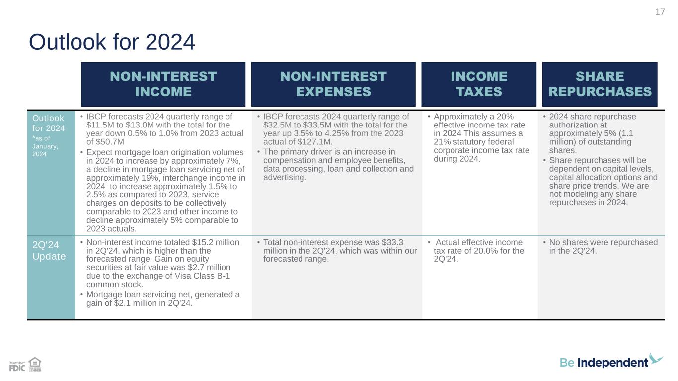 Outlook for 2024 Outlook for 2024 *as of January, 2024 • IBCP forecast of mid-single digit (approximately 6%-8%) overall loan growth is based on increases in commercial loans and mortgage loans with installment loans remaining flat. Expect much of this growth to occur in the first three quarters of 2024. • This growth forecast also assumes a stable Michigan economy. • The forecast assumes 0.25% Fed rate cuts in May, June, August and October in the federal funds rate while long-term interest rates decline slightly over year-end 2023 levels. • IBCP forecast of mid-single digit (6%-8%) growth is primarily supported by an increase in earning assets and a favorable shift in the earning asset base. Expect the net interest margin (NIM) to increase (0.10% - 0.15%) in 2024 compared to full-year 2023. Primary driver is an increase in earning asset yield that is partially offset by an increase in yield on interest bearing liabilities. • Very difficult area to forecast. Future provision levels under CECL will be particularly sensitive to loan growth and mix, projected economic conditions, watch credit levels and loan default volumes. • The allowance as a percentage of total loans was at 1.44% at 12/31/23 • A full year 2024 provision (expense) for credit losses of approximately 0.15%-0.25% of average total portfolio loans would not be unreasonable. 2Q'24 Update • Total portfolio loans increased $11.9 million (1.2% annualized) in 2Q’24 which is below our forecasted range. • Installment loans and mortgage loans increased $3.9 million (2.6% annualized) and $10.9 million (3.0% annualized), respectively. Commercial loans decreased $2.9 million (-0.7% annualized) in the second quarter. • 2Q'24 net interest income was $3.0 million (7.8%) higher than the prior year quarter. The net interest margin was 3.40% for the current quarter and 3.24% for the prior year quarter and up 0.10% from the linked quarter. • The $3.0 million increase in net interest income is due to a $130.1 million increase in average earning assets and a 0.16% increase in the net interest margin. • The provision for credit losses was an expense of $0.02 million (0.00% of average loans annualized). LENDING Continued growth NET INTEREST INCOME Growth driven primarily by higher average earning assets PROVISION FOR CREDIT LOSSES Steady asset quality metrics 16