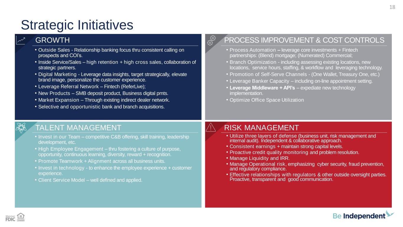 Outlook for 2024 Outlook for 2024 *as of January, 2024 • IBCP forecasts 2024 quarterly range of $11.5M to $13.0M with the total for the year down 0.5% to 1.0% from 2023 actual of $50.7M • Expect mortgage loan origination volumes in 2024 to increase by approximately 7%, a decline in mortgage loan servicing net of approximately 19%, interchange income in 2024 to increase approximately 1.5% to 2.5% as compared to 2023, service charges on deposits to be collectively comparable to 2023 and other income to decline approximately 5% comparable to 2023 actuals. • IBCP forecasts 2024 quarterly range of $32.5M to $33.5M with the total for the year up 3.5% to 4.25% from the 2023 actual of $127.1M. • The primary driver is an increase in compensation and employee benefits, data processing, loan and collection and advertising. • Approximately a 20% effective income tax rate in 2024 This assumes a 21% statutory federal corporate income tax rate during 2024. • 2024 share repurchase authorization at approximately 5% (1.1 million) of outstanding shares. • Share repurchases will be dependent on capital levels, capital allocation options and share price trends. We are not modeling any share repurchases in 2024. 2Q'24 Update • Non-interest income totaled $15.2 million in 2Q'24, which is higher than the forecasted range. Gain on equity securities at fair value was $2.7 million due to the exchange of Visa Class B-1 common stock. • Mortgage loan servicing net, generated a gain of $2.1 million in 2Q'24. • Total non-interest expense was $33.3 million in the 2Q'24, which was within our forecasted range. • Actual effective income tax rate of 20.0% for the 2Q'24. • No shares were repurchased in the 2Q'24. NON-INTEREST INCOME NON-INTEREST EXPENSES INCOME TAXES SHARE REPURCHASES 17