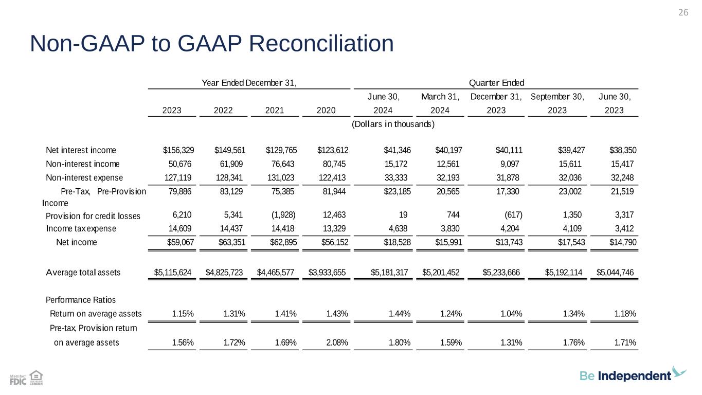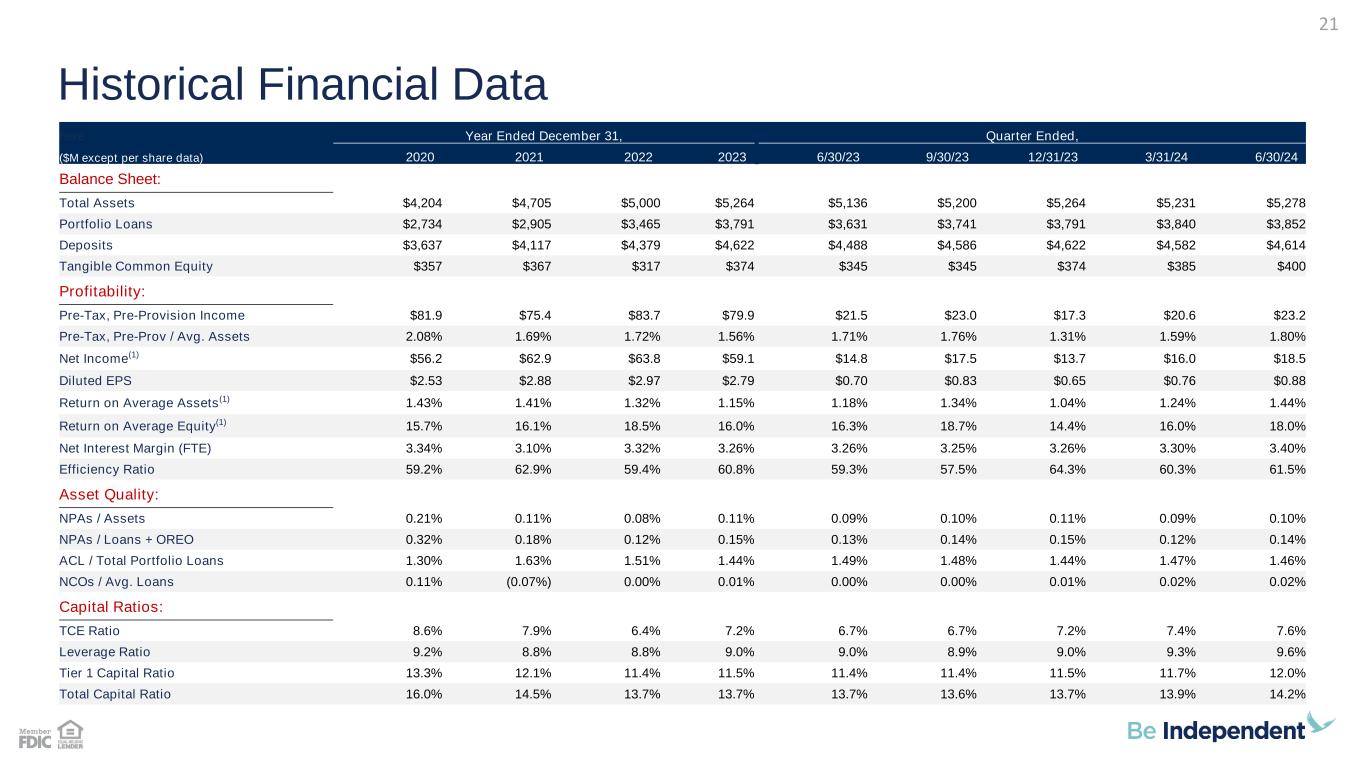 here Year Ended December 31, Quarter Ended, ($M except per share data) 2020 2021 2022 2023 6/30/23 9/30/23 12/31/23 3/31/24 6/30/24 Balance Sheet: Total Assets $4,204 $4,705 $5,000 $5,264 $5,136 $5,200 $5,264 $5,231 $5,278 Portfolio Loans $2,734 $2,905 $3,465 $3,791 $3,631 $3,741 $3,791 $3,840 $3,852 Deposits $3,637 $4,117 $4,379 $4,622 $4,488 $4,586 $4,622 $4,582 $4,614 Tangible Common Equity $357 $367 $317 $374 $345 $345 $374 $385 $400 Profitability: Pre-Tax, Pre-Provision Income $81.9 $75.4 $83.7 $79.9 $21.5 $23.0 $17.3 $20.6 $23.2 Pre-Tax, Pre-Prov / Avg. Assets 2.08% 1.69% 1.72% 1.56% 1.71% 1.76% 1.31% 1.59% 1.80% Net Income(1) $56.2 $62.9 $63.8 $59.1 $14.8 $17.5 $13.7 $16.0 $18.5 Diluted EPS $2.53 $2.88 $2.97 $2.79 $0.70 $0.83 $0.65 $0.76 $0.88 Return on Average Assets(1) 1.43% 1.41% 1.32% 1.15% 1.18% 1.34% 1.04% 1.24% 1.44% Return on Average Equity(1) 15.7% 16.1% 18.5% 16.0% 16.3% 18.7% 14.4% 16.0% 18.0% Net Interest Margin (FTE) 3.34% 3.10% 3.32% 3.26% 3.26% 3.25% 3.26% 3.30% 3.40% Efficiency Ratio 59.2% 62.9% 59.4% 60.8% 59.3% 57.5% 64.3% 60.3% 61.5% Asset Quality: NPAs / Assets 0.21% 0.11% 0.08% 0.11% 0.09% 0.10% 0.11% 0.09% 0.10% NPAs / Loans + OREO 0.32% 0.18% 0.12% 0.15% 0.13% 0.14% 0.15% 0.12% 0.14% ACL / Total Portfolio Loans 1.30% 1.63% 1.51% 1.44% 1.49% 1.48% 1.44% 1.47% 1.46% NCOs / Avg. Loans 0.11% (0.07%) 0.00% 0.01% 0.00% 0.00% 0.01% 0.02% 0.02% Capital Ratios: TCE Ratio 8.6% 7.9% 6.4% 7.2% 6.7% 6.7% 7.2% 7.4% 7.6% Leverage Ratio 9.2% 8.8% 8.8% 9.0% 9.0% 8.9% 9.0% 9.3% 9.6% Tier 1 Capital Ratio 13.3% 12.1% 11.4% 11.5% 11.4% 11.4% 11.5% 11.7% 12.0% Total Capital Ratio 16.0% 14.5% 13.7% 13.7% 13.7% 13.6% 13.7% 13.9% 14.2% Historical Financial Data 21