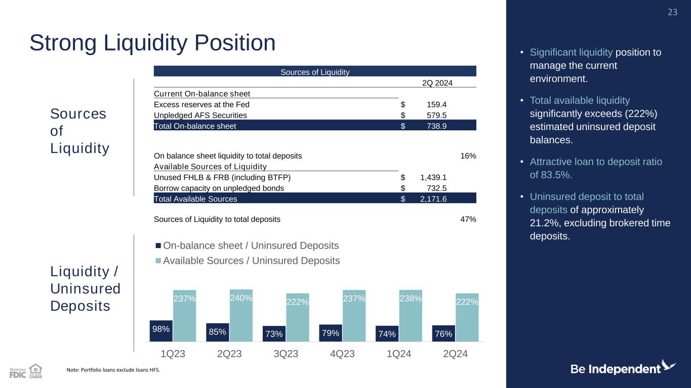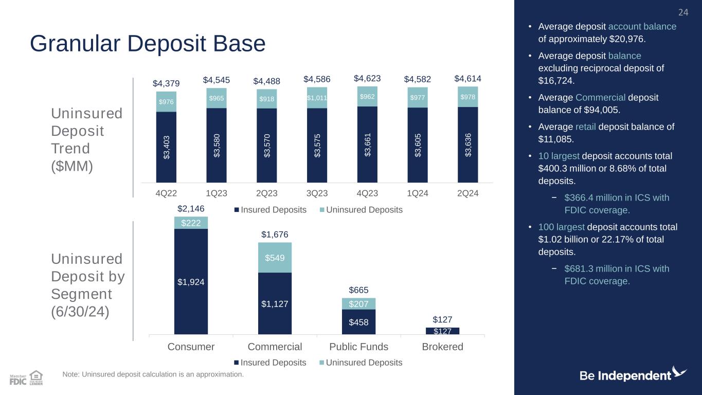 Sources of Liquidity 2Q 2024 Current On-balance sheet Excess reserves at the Fed $ 159.4 Unpledged AFS Securities $ 579.5 Total On-balance sheet $ 738.9 On balance sheet liquidity to total deposits 16% Available Sources of Liquidity Unused FHLB & FRB (including BTFP) $ 1,439.1 Borrow capacity on unpledged bonds $ 732.5 Total Available Sources $ 2,171.6 Sources of Liquidity to total deposits 47% Note: Portfolio loans exclude loans HFS. Liquidity / Uninsured Deposits Strong Liquidity Position • Significant liquidity position to manage the current environment. • Total available liquidity significantly exceeds (222%) estimated uninsured deposit balances. • Attractive loan to deposit ratio of 83.5%. • Uninsured deposit to total deposits of approximately 21.2%, excluding brokered time deposits. Sources of Liquidity 23 98% 85% 73% 79% 74% 76% 237% 240% 222% 237% 238% 222% 1Q23 2Q23 3Q23 4Q23 1Q24 2Q24 On-balance sheet / Uninsured Deposits Available Sources / Uninsured Deposits