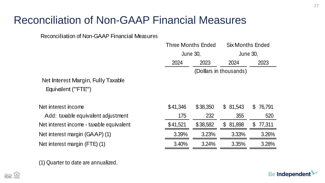 Non-GAAP to GAAP Reconciliation 26 June 30, March 31, December 31, September 30, June 30, 2023 2022 2021 2020 2024 2024 2023 2023 2023 Net interest income $156,329 $149,561 $129,765 $123,612 $41,346 $40,197 $40,111 $39,427 $38,350 Non-interest income 50,676 61,909 76,643 80,745 15,172 12,561 9,097 15,611 15,417 Non-interest expense 127,119 128,341 131,023 122,413 33,333 32,193 31,878 32,036 32,248 Pre-Tax, Pre-Provision Income 79,886 83,129 75,385 81,944 $23,185 20,565 17,330 23,002 21,519 Provision for credit losses 6,210 5,341 (1,928) 12,463 19 744 (617) 1,350 3,317 Income tax expense 14,609 14,437 14,418 13,329 4,638 3,830 4,204 4,109 3,412 Net income $59,067 $63,351 $62,895 $56,152 $18,528 $15,991 $13,743 $17,543 $14,790 Average total assets $5,115,624 $4,825,723 $4,465,577 $3,933,655 $5,181,317 $5,201,452 $5,233,666 $5,192,114 $5,044,746 Performance Ratios Return on average assets 1.15% 1.31% 1.41% 1.43% 1.44% 1.24% 1.04% 1.34% 1.18% Pre-tax, Provision return on average assets 1.56% 1.72% 1.69% 2.08% 1.80% 1.59% 1.31% 1.76% 1.71% Year Ended December 31, Quarter Ended (Dollars in thousands)