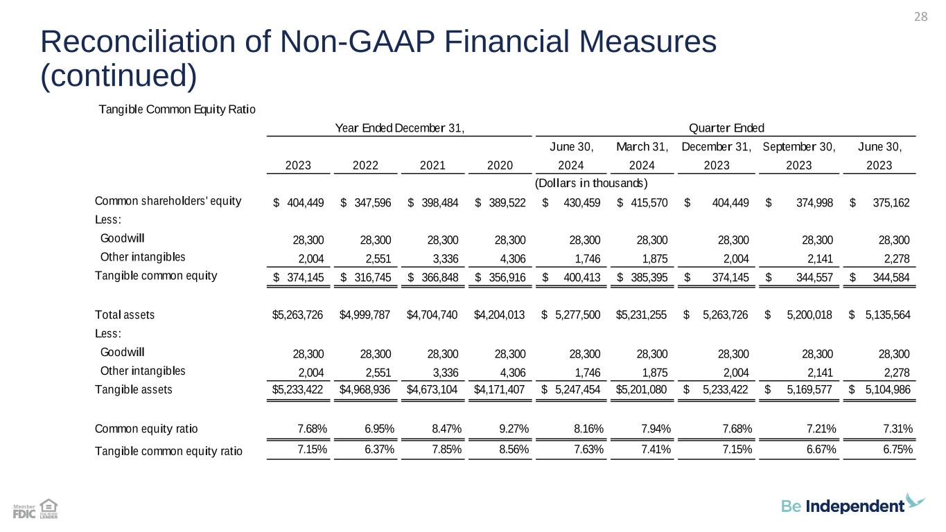 Reconciliation of Non-GAAP Financial Measures 27 Reconciliation of Non-GAAP Financial Measures 2024 2023 2024 2023 Net Interest Margin, Fully Taxable Equivalent ("FTE") Net interest income 41,346$ 38,350$ 81,543$ 76,791$ Add: taxable equivalent adjustment 175 232 355 520 Net interest income - taxable equivalent 41,521$ 38,582$ 81,898$ 77,311$ Net interest margin (GAAP) (1) 3.39% 3.23% 3.33% 3.26% Net interest margin (FTE) (1) 3.40% 3.24% 3.35% 3.28% (1) Quarter to date are annualized. Three Months Ended Six Months Ended June 30, June 30, (Dollars in thousands)