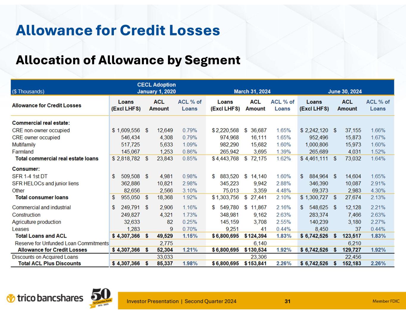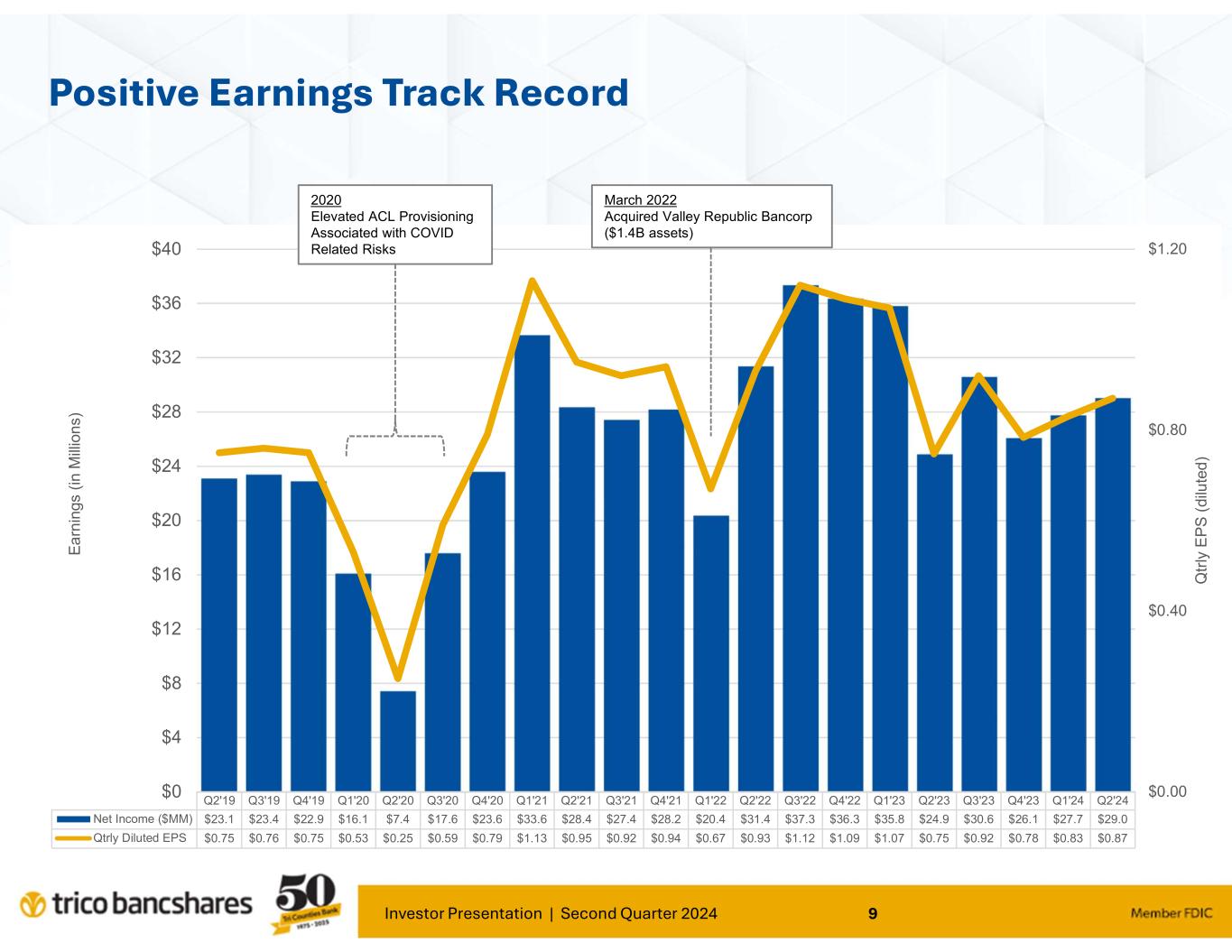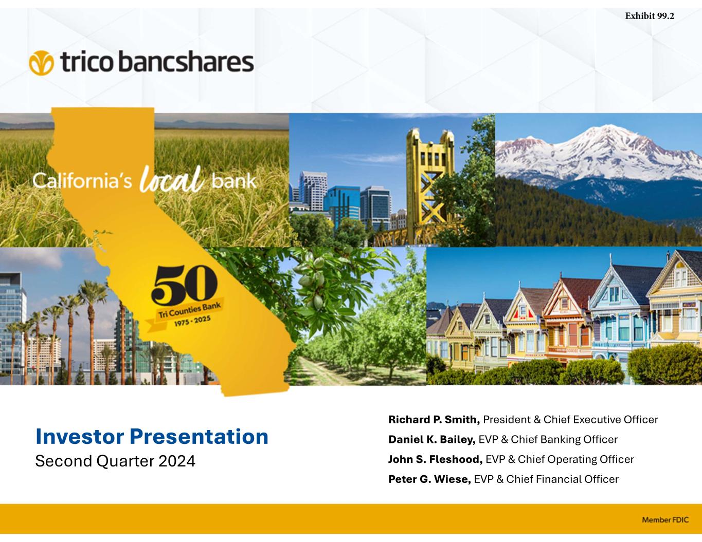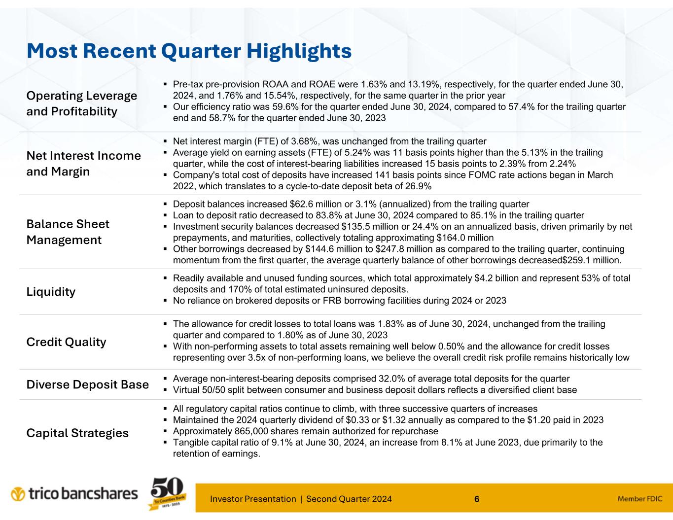 “Our results for the second quarter continued to demonstrate TriCo’s stability and ability to operate effectively under various and changing economic environments. Our focus on core deposit growth and relationship banking continues to provide positive traction for our Bank," said Rick Smith, President and CEO. Smith further commented; "Our loan portfolio risk trends remain strong as the credit cycle continues to normalize as compared to the past several years. Borrowers continue to be responsive and supportive of our proactive efforts to manage credit risk.”