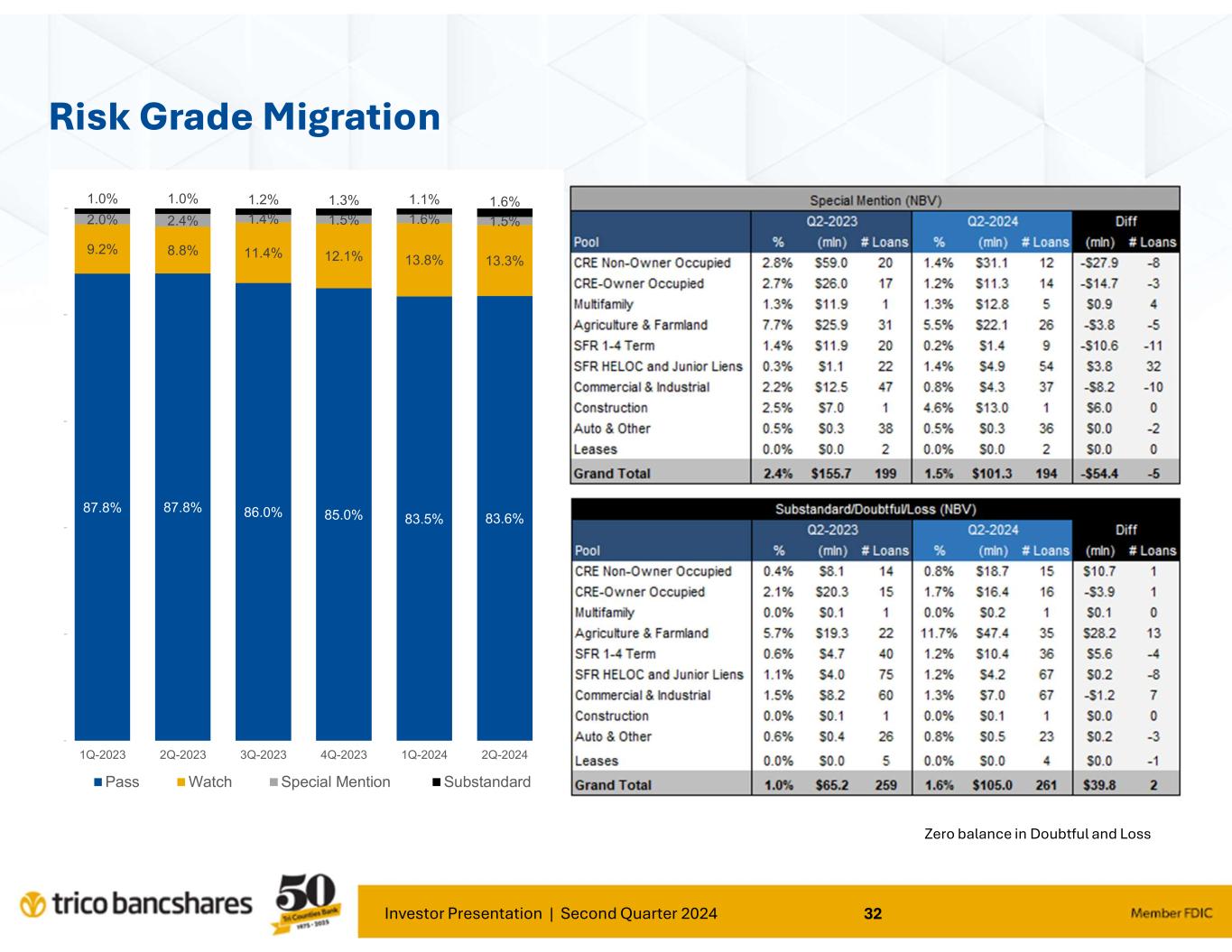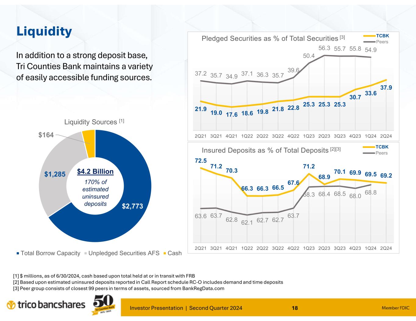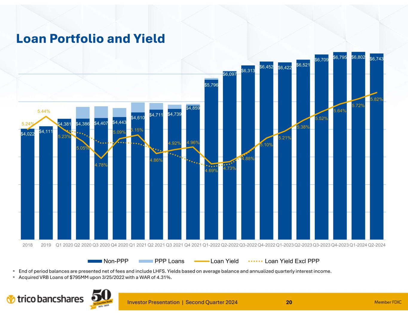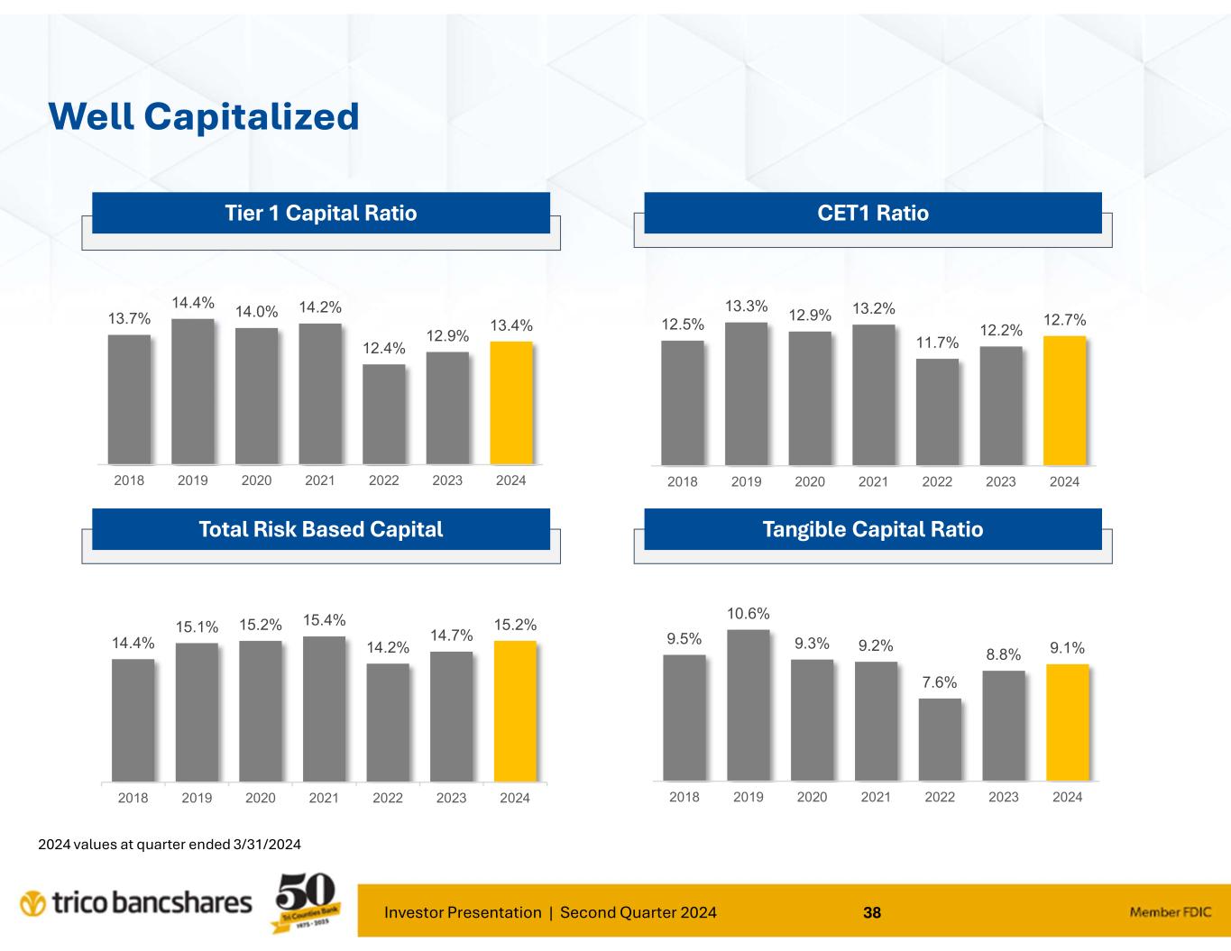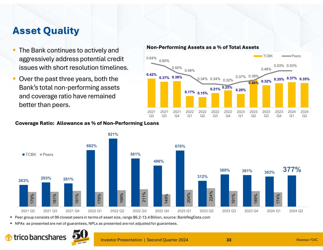 “Our results for the second quarter continued to demonstrate TriCo’s stability and ability to operate effectively under various and changing economic environments. Our focus on core deposit growth and relationship banking continues to provide positive traction for our Bank," said Rick Smith, President and CEO. Smith further commented; "Our loan portfolio risk trends remain strong as the credit cycle continues to normalize as compared to the past several years. Borrowers continue to be responsive and supportive of our proactive efforts to manage credit risk.”