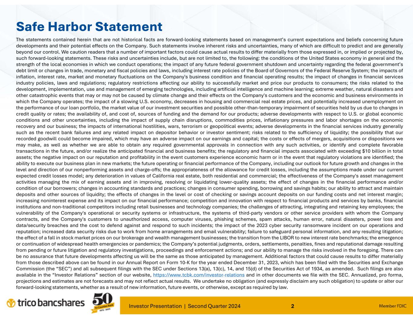 Investor Presentation | Second Quarter 2024 2 Safe Harbor Statement The statements contained herein that are not historical facts are forward-looking statements based on management’s current expectations and beliefs concerning future developments and their potential effects on the Company. Such statements involve inherent risks and uncertainties, many of which are difficult to predict and are generally beyond our control. We caution readers that a number of important factors could cause actual results to differ materially from those expressed in, or implied or projected by, such forward-looking statements. These risks and uncertainties include, but are not limited to, the following: the conditions of the United States economy in general and the strength of the local economies in which we conduct operations; the impact of any future federal government shutdown and uncertainty regarding the federal government’s debt limit or changes in trade, monetary and fiscal policies and laws, including interest rate policies of the Board of Governors of the Federal Reserve System; the impacts of inflation, interest rate, market and monetary fluctuations on the Company's business condition and financial operating results; the impact of changes in financial services industry policies, laws and regulations; regulatory restrictions affecting our ability to successfully market and price our products to consumers; the risks related to the development, implementation, use and management of emerging technologies, including artificial intelligence and machine learning; extreme weather, natural disasters and other catastrophic events that may or may not be caused by climate change and their effects on the Company's customers and the economic and business environments in which the Company operates; the impact of a slowing U.S. economy, decreases in housing and commercial real estate prices, and potentially increased unemployment on the performance of our loan portfolio, the market value of our investment securities and possible other-than-temporary impairment of securities held by us due to changes in credit quality or rates; the availability of, and cost of, sources of funding and the demand for our products; adverse developments with respect to U.S. or global economic conditions and other uncertainties, including the impact of supply chain disruptions, commodities prices, inflationary pressures and labor shortages on the economic recovery and our business; the impacts of international hostilities, wars, terrorism or geopolitical events; adverse developments in the financial services industry generally such as the recent bank failures and any related impact on depositor behavior or investor sentiment; risks related to the sufficiency of liquidity; the possibility that our recorded goodwill could become impaired, which may have an adverse impact on our earnings and capital; the costs or effects of mergers, acquisitions or dispositions we may make, as well as whether we are able to obtain any required governmental approvals in connection with any such activities, or identify and complete favorable transactions in the future, and/or realize the anticipated financial and business benefits; the regulatory and financial impacts associated with exceeding $10 billion in total assets; the negative impact on our reputation and profitability in the event customers experience economic harm or in the event that regulatory violations are identified; the ability to execute our business plan in new markets; the future operating or financial performance of the Company, including our outlook for future growth and changes in the level and direction of our nonperforming assets and charge-offs; the appropriateness of the allowance for credit losses, including the assumptions made under our current expected credit losses model; any deterioration in values of California real estate, both residential and commercial; the effectiveness of the Company's asset management activities managing the mix of earning assets and in improving, resolving or liquidating lower-quality assets; the effect of changes in the financial performance and/or condition of our borrowers; changes in accounting standards and practices; changes in consumer spending, borrowing and savings habits; our ability to attract and maintain deposits and other sources of liquidity; the effects of changes in the level or cost of checking or savings account deposits on our funding costs and net interest margin; increasing noninterest expense and its impact on our financial performance; competition and innovation with respect to financial products and services by banks, financial institutions and non-traditional competitors including retail businesses and technology companies; the challenges of attracting, integrating and retaining key employees; the vulnerability of the Company's operational or security systems or infrastructure, the systems of third-party vendors or other service providers with whom the Company contracts, and the Company's customers to unauthorized access, computer viruses, phishing schemes, spam attacks, human error, natural disasters, power loss and data/security breaches and the cost to defend against and respond to such incidents; the impact of the 2023 cyber security ransomware incident on our operations and reputation; increased data security risks due to work from home arrangements and email vulnerability; failure to safeguard personal information, and any resulting litigation; the effect of a fall in stock market prices on our brokerage and wealth management businesses; the transition from the LIBOR to new interest rate benchmarks; the emergence or continuation of widespread health emergencies or pandemics; the Company’s potential judgments, orders, settlements, penalties, fines and reputational damage resulting from pending or future litigation and regulatory investigations, proceedings and enforcement actions; and our ability to manage the risk