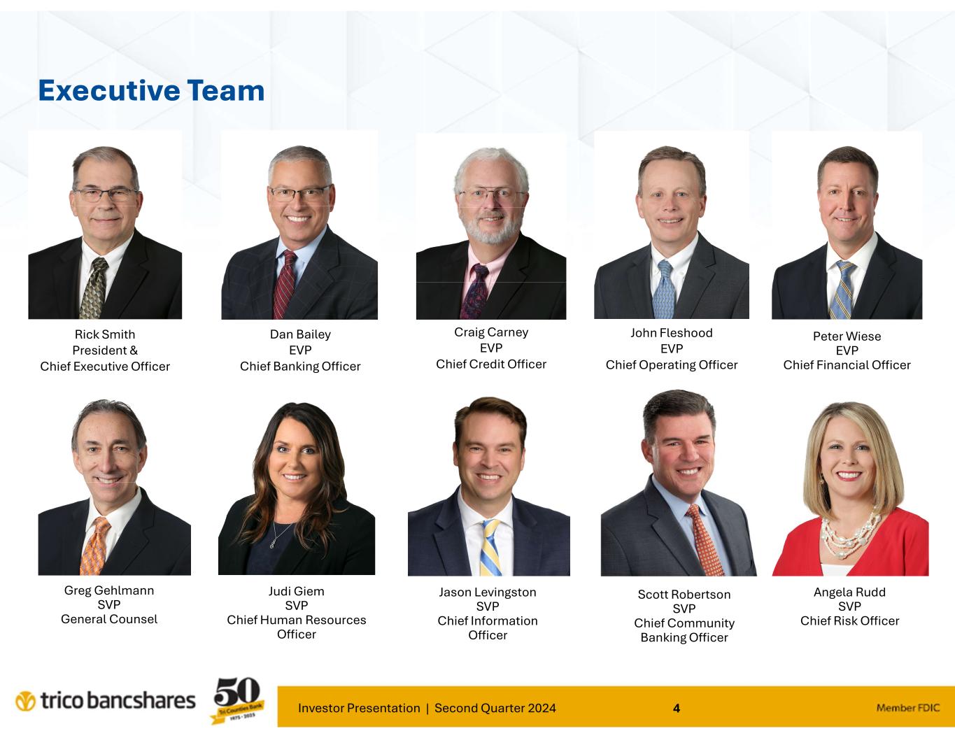 Investor Presentation | Second Quarter 2024 3 Tri Counties Bank Awards Forbes Magazine America’s Best Banks 2024 Best-In-State Bank 2021 Sacramento Rainbow Chamber of Commerce Corporate Advocate of the Year 2024 Cen Cal Business Finance Group SBA-504 Lender of the Year 2023 Sacramento Business Journal Best Places to Work 2024 Corporate Citizenship: Corporate Champion for Basic Needs 2022 S&P Global Market Intelligence Top Community Bank with $3 billion to $10 billion in assets 2022, 2023 Record Searchlight Best Bank in the North State 2015, 2016, 2018, 2022, 2023 Chico Enterprise Record Readers' Choice Best Bank Won every year from 2019 to 2024 Chico News & Review Best Bank Won every year from 2008 to 2019, then 2022 and 2023 Marysville Appeal-Democrat Favorite Bank 2019, 2021, 2023 Formstack: Practically Genius Award Creative Digital Innovation of the Year 2021 Colusa County Pioneer Review Best Bank Won every year from 2019 to 2021 Times Standard Best of North Coast 2020 Gustine Press-Standard Best Bank 2023 Style Magazine Reader's Choice – Roseville, Granite Bay & Rocklin Won every year from 2011 to 2023 California Black Chamber of Commerce Top Partner Award 2023 Raymond James Community Bankers Cup Award Top 10% of Community Banks 2019, 2021, 2022 Habitat for Humanity of Greater Sacramento Hammy Award: Finance Partner 2022 Auburn Journal Best Bank Won every year from 2019 to 2022 Grass Valley Union Best of Nevada County Won every year from 2011 to 2023