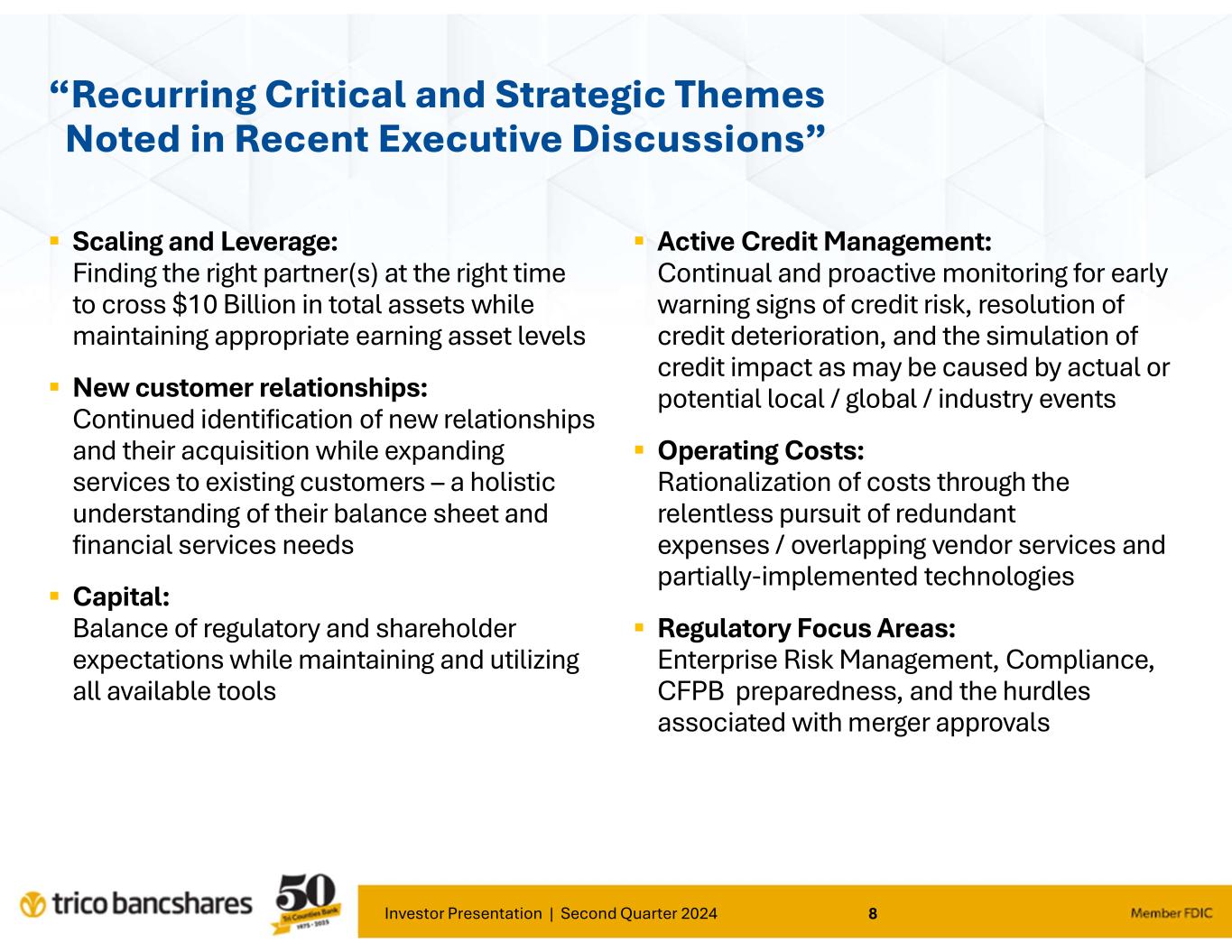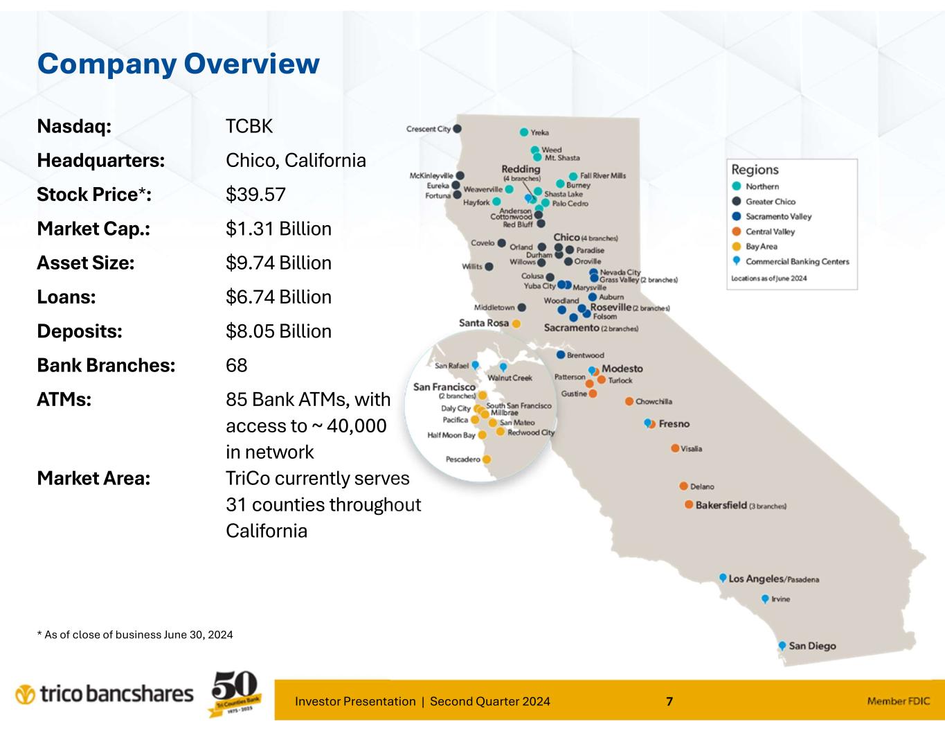 Investor Presentation | Second Quarter 2024 7 Company Overview Nasdaq: TCBK Headquarters: Chico, California Stock Price*: $39.57 Market Cap.: $1.31 Billion Asset Size: $9.74 Billion Loans: $6.74 Billion Deposits: $8.05 Billion Bank Branches: 68 ATMs: 85 Bank ATMs, with access to ~ 40,000 in network Market Area: TriCo currently serves 31 counties throughout California * As of close of business June 30, 2024