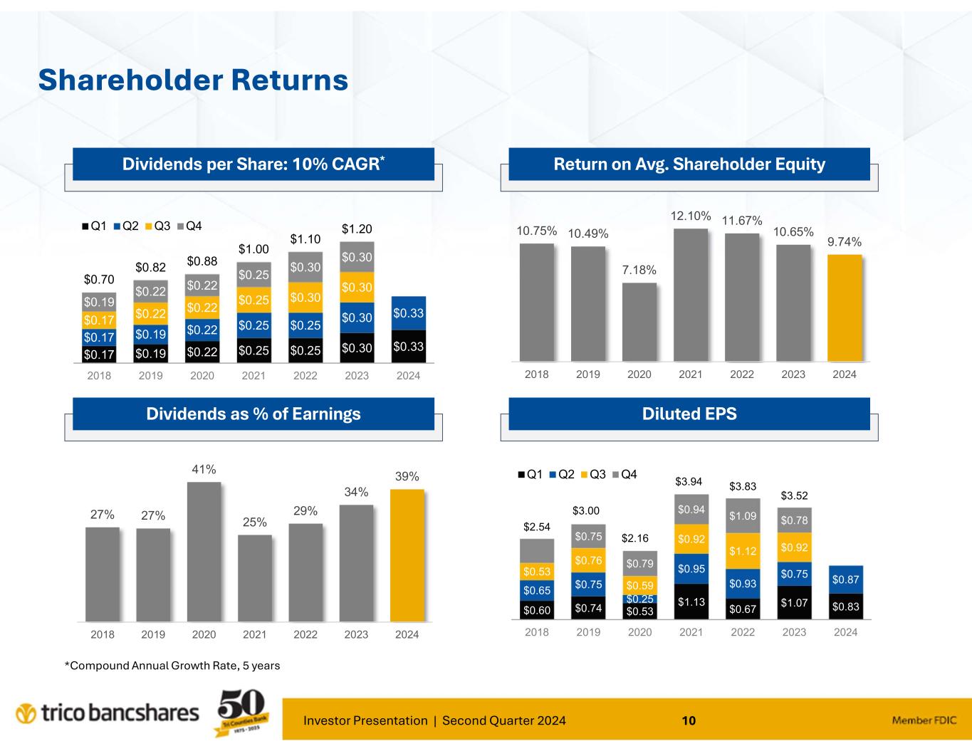 Investor Presentation | Second Quarter 2024 9 Q2'19 Q3'19 Q4'19 Q1'20 Q2'20 Q3'20 Q4'20 Q1'21 Q2'21 Q3'21 Q4'21 Q1'22 Q2'22 Q3'22 Q4'22 Q1'23 Q2'23 Q3'23 Q4'23 Q1'24 Q2'24 Net Income ($MM) $23.1 $23.4 $22.9 $16.1 $7.4 $17.6 $23.6 $33.6 $28.4 $27.4 $28.2 $20.4 $31.4 $37.3 $36.3 $35.8 $24.9 $30.6 $26.1 $27.7 $29.0 Qtrly Diluted EPS $0.75 $0.76 $0.75 $0.53 $0.25 $0.59 $0.79 $1.13 $0.95 $0.92 $0.94 $0.67 $0.93 $1.12 $1.09 $1.07 $0.75 $0.92 $0.78 $0.83 $0.87 $0.00 $0.40 $0.80 $1.20 $0 $4 $8 $12 $16 $20 $24 $28 $32 $36 $40 Q tr ly E P S ( di lu te d) E a rn in gs ( in M ill io n s) Positive Earnings Track Record March 2022 Acquired Valley Republic Bancorp ($1.4B assets) 2020 Elevated ACL Provisioning Associated with COVID Related Risks