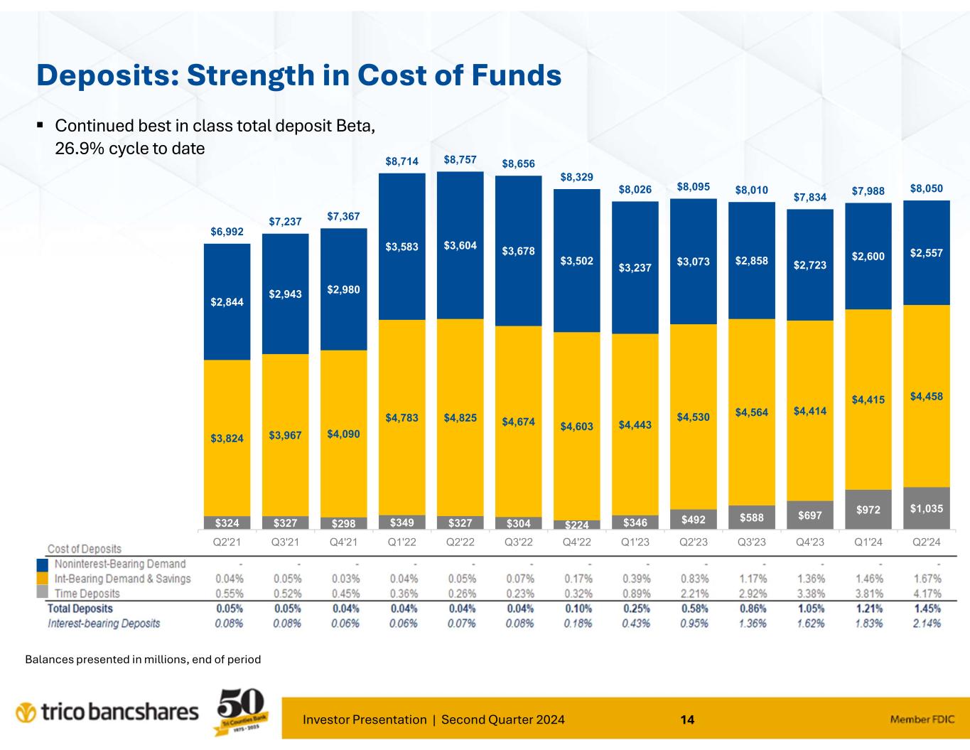 Investor Presentation | Second Quarter 2024 13 4 0 .7 4 0 .7 4 0 .4 4 1 .1 4 1 .2 4 2 .5 4 2 .0 4 0 .3 3 8 .0 3 5 .7 3 4 .8 3 2 .6 3 1 .8 0 10 20 30 40 2021 Q2 2021 Q3 2021 Q4 2022 Q1 2022 Q2 2022 Q3 2022 Q4 2023 Q1 2023 Q2 2023 Q3 2023 Q4 2024 Q1 2024 Q2 Non Interest-bearing Deposits as % of Total Deposits TCBK Peers 7 0 .1 6 6 .9 6 6 .0 6 6 .4 6 9 .1 7 2 .1 7 6 .5 7 9 .5 8 0 .4 8 4 .0 8 7 .7 8 7 .7 8 6 .6 0 20 40 60 80 100 120 2021 Q2 2021 Q3 2021 Q4 2022 Q1 2022 Q2 2022 Q3 2022 Q4 2023 Q1 2023 Q2 2023 Q3 2023 Q4 2024 Q1 2024 Q2 Loans to Core Deposits (%) TCBK Peers Liability Mix: Strength in Funding Total Deposits = $8.05 billion 95.8% of Funding Liabilities Liability Mix 06/30/2024 Peer group consists of 99 closest peers in terms of asset size, range $4.7-11.5 Billion; source: BankRegData.com Net Loans includes LHFS and Allowance for Credit Loss; Core Deposits = Total Deposits less CDs > 250k and Brokered Deposits (0.03% Funding Cost) Non Interest- bearing Demand Deposits, 29.9% Interest-bearing Demand & Savings Deposits, 52.0% Time Deposits, 12.1% Borrowings & Subordinated Debt, 4.1% Other liabilities, 2.0%