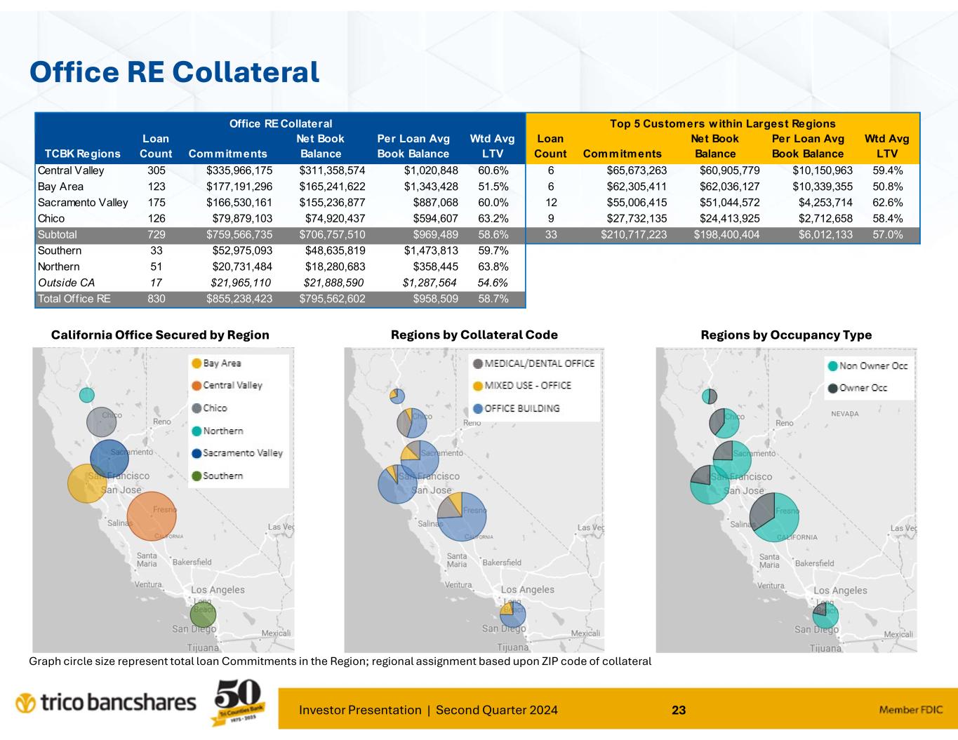 Investor Presentation | Second Quarter 2024 23 Office RE Collateral Graph circle size represent total loan Commitments in the Region; regional assignment based upon ZIP code of collateral California Office Secured by Region Regions by Collateral Code Regions by Occupancy Type TCBK Regions Loan Count Commitments Net Book Balance Per Loan Avg Book Balance Wtd Avg LTV Loan Count Commitments Net Book Balance Per Loan Avg Book Balance Wtd Avg LTV Central Valley 305 $335,966,175 $311,358,574 $1,020,848 60.6% 6 $65,673,263 $60,905,779 $10,150,963 59.4% Bay Area 123 $177,191,296 $165,241,622 $1,343,428 51.5% 6 $62,305,411 $62,036,127 $10,339,355 50.8% Sacramento Valley 175 $166,530,161 $155,236,877 $887,068 60.0% 12 $55,006,415 $51,044,572 $4,253,714 62.6% Chico 126 $79,879,103 $74,920,437 $594,607 63.2% 9 $27,732,135 $24,413,925 $2,712,658 58.4% Subtotal 729 $759,566,735 $706,757,510 $969,489 58.6% 33 $210,717,223 $198,400,404 $6,012,133 57.0% Southern 33 $52,975,093 $48,635,819 $1,473,813 59.7% Northern 51 $20,731,484 $18,280,683 $358,445 63.8% Outside CA 17 $21,965,110 $21,888,590 $1,287,564 54.6% Total Off ice RE 830 $855,238,423 $795,562,602 $958,509 58.7% Top 5 Customers w ithin Largest RegionsOffice RE Collateral