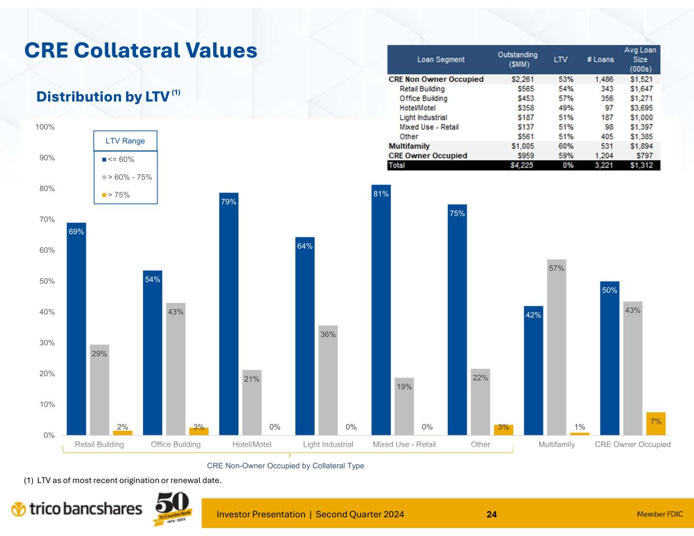Investor Presentation | Second Quarter 2024 24 69% 54% 79% 64% 81% 75% 42% 50% 29% 43% 21% 36% 19% 22% 57% 43% 2% 3% 0% 0% 0% 3% 1% 7% 0% 10% 20% 30% 40% 50% 60% 70% 80% 90% 100% Retail Building Office Building Hotel/Motel Light Industrial Mixed Use - Retail Other Multifamily CRE Owner Occupied <= 60% > 60% - 75% > 75% CRE Collateral Values Distribution by LTV (1) LTV Range (1) LTV as of most recent origination or renewal date. CRE Non-Owner Occupied by Collateral Type
