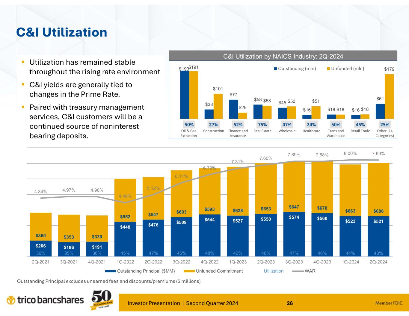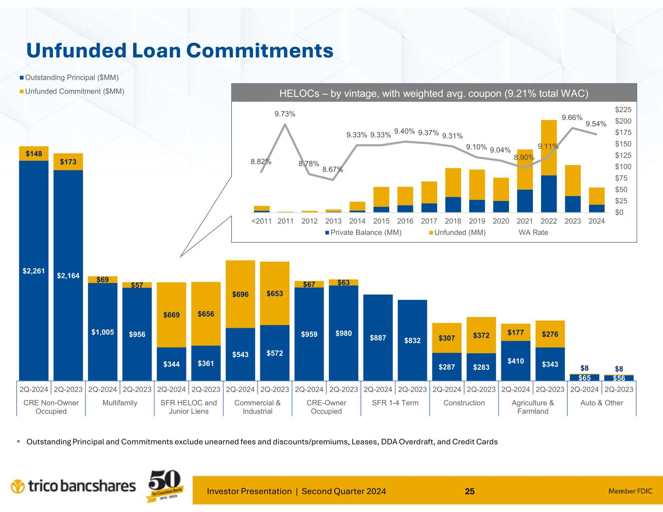 Investor Presentation | Second Quarter 2024 25 $2,261 $2,164 $1,005 $956 $344 $361 $543 $572 $959 $980 $887 $832 $287 $283 $410 $343 $65 $56 $148 $173 $69 $57 $669 $656 $696 $653 $67 $63 $307 $372 $177 $276 $8 $8 2Q-2024 2Q-2023 2Q-2024 2Q-2023 2Q-2024 2Q-2023 2Q-2024 2Q-2023 2Q-2024 2Q-2023 2Q-2024 2Q-2023 2Q-2024 2Q-2023 2Q-2024 2Q-2023 2Q-2024 2Q-2023 CRE Non-Owner Occupied Multifamily SFR HELOC and Junior Liens Commercial & Industrial CRE-Owner Occupied SFR 1-4 Term Construction Agriculture & Farmland Auto & Other Outstanding Principal ($MM) Unfunded Commitment ($MM) Unfunded Loan Commitments HELOCs – by vintage, with weighted avg. coupon (9.21% total WAC) Outstanding Principal and Commitments exclude unearned fees and discounts/premiums, Leases, DDA Overdraft, and Credit Cards 8.00% 8.20% 8.40% 8.60% 8.80% 9.00% 9.20% 9.40% 9.60% 9.80% 10.00% $0 $25 $50 $75 $100 $125 $150 $175 $200 $225 20242023202220212020201920182017201620152014201320122011<2011 Private Balance (MM) Unfunded (MM) WA Rate 9.54% 9.66% 9.11% 8.90% 9.04%9.10% 9.31%9.37%9.40%9.33%9.33% 8.67% 8.78% 9.73% 8.82%