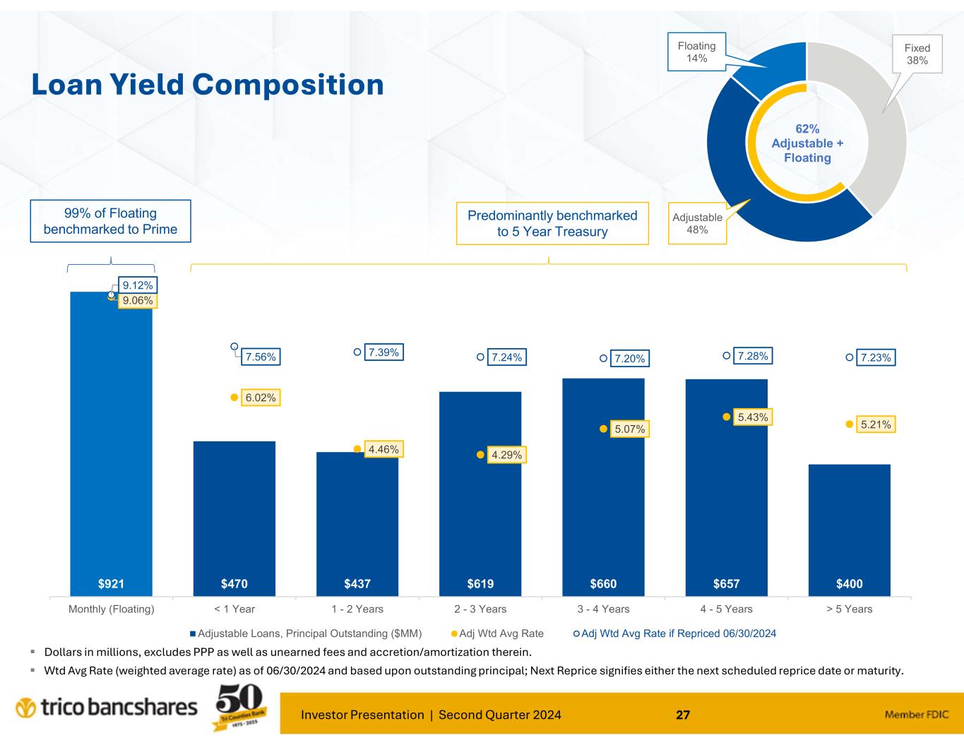 Investor Presentation | Second Quarter 2024 26 C&I Utilization Outstanding Principal excludes unearned fees and discounts/premiums ($ millions) Utilization has remained stable throughout the rising rate environment C&I yields are generally tied to changes in the Prime Rate. Paired with treasury management services, C&I customers will be a continued source of noninterest bearing deposits. C&I Utilization by NAICS Industry: 2Q-2024 $206 $186 $191 $448 $476 $509 $544 $527 $550 $574 $560 $523 $521 $360 $353 $339 $552 $547 $603 $593 $628 $653 $647 $670 $663 $686 36% 35% 36% 45% 47% 46% 48% 46% 46% 47% 46% 44% 43% 4.84% 4.97% 4.96% 4.46% 5.12% 6.11% 6.79% 7.31% 7.60% 7.89% 7.88% 8.00% 7.99% 0% 1% 2% 3% 4% 5% 6% 7% 8% 9% $0 $200 $400 $600 $800 $1,000 $1,200 $1,400 2Q-2021 3Q-2021 4Q-2021 1Q-2022 2Q-2022 3Q-2022 4Q-2022 1Q-2023 2Q-2023 3Q-2023 4Q-2023 1Q-2024 2Q-2024 Outstanding Principal ($MM) Unfunded Commitment Utilization WAR $193 $38 $77 $58 $45 $16 $18 $16 $61 $191 $101 $25 $53 $50 $51 $18 $18 $179 50% 27% 52% 75% 47% 24% 50% 45% 25% 0% 5000% 10000% 15000% 20000% Oil & Gas Extraction Construction Finance and Insurance Real Estate Wholesale Healthcare Trans and Warehouse Retail Trade Other (14 Categories) Outstanding (mln) Unfunded (mln)