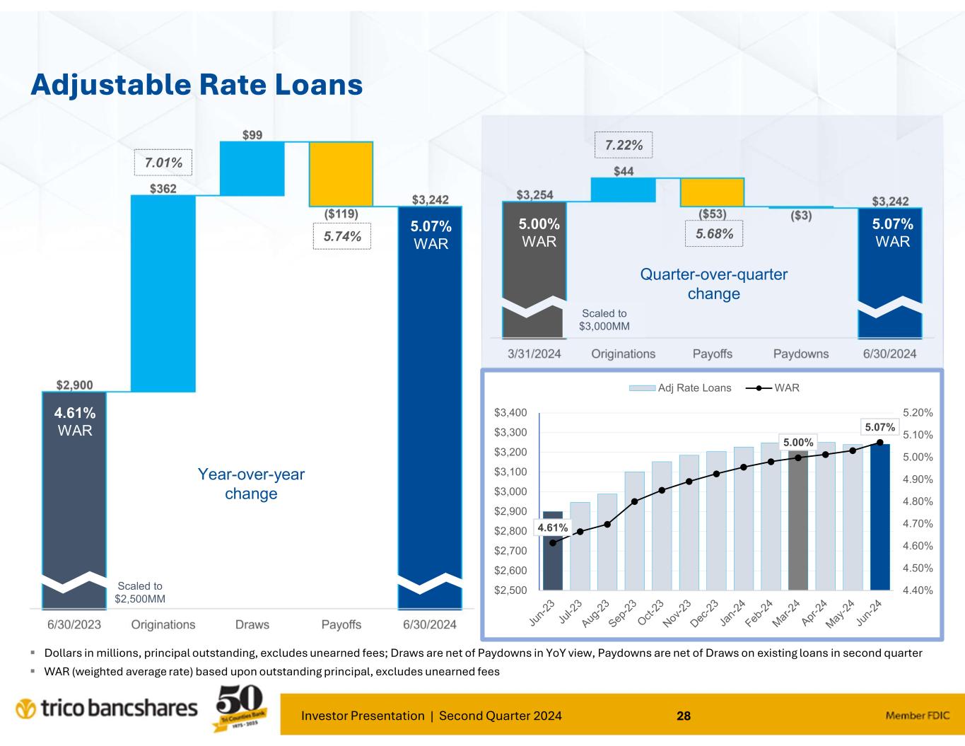 Investor Presentation | Second Quarter 2024 27 $921 $470 $437 $619 $660 $657 $400 9.06% 6.02% 4.46% 4.29% 5.07% 5.43% 5.21% 9.12% 7.56% 7.39% 7.24% 7.20% 7.28% 7.23% 0.00% 1.00% 2.00% 3.00% 4.00% 5.00% 6.00% 7.00% 8.00% 9.00% 10.00% - 100 200 300 400 500 600 700 800 900 1,000 Monthly (Floating) < 1 Year 1 - 2 Years 2 - 3 Years 3 - 4 Years 4 - 5 Years > 5 Years Adjustable Loans, Principal Outstanding ($MM) Adj Wtd Avg Rate Adj Wtd Avg Rate if Repriced 06/30/2024 Loan Yield Composition Dollars in millions, excludes PPP as well as unearned fees and accretion/amortization therein. Wtd Avg Rate (weighted average rate) as of 06/30/2024 and based upon outstanding principal; Next Reprice signifies either the next scheduled reprice date or maturity. 99% of Floating benchmarked to Prime Predominantly benchmarked to 5 Year Treasury 62% Adjustable + Floating Fixed 38% Adjustable 48% Floating 14%