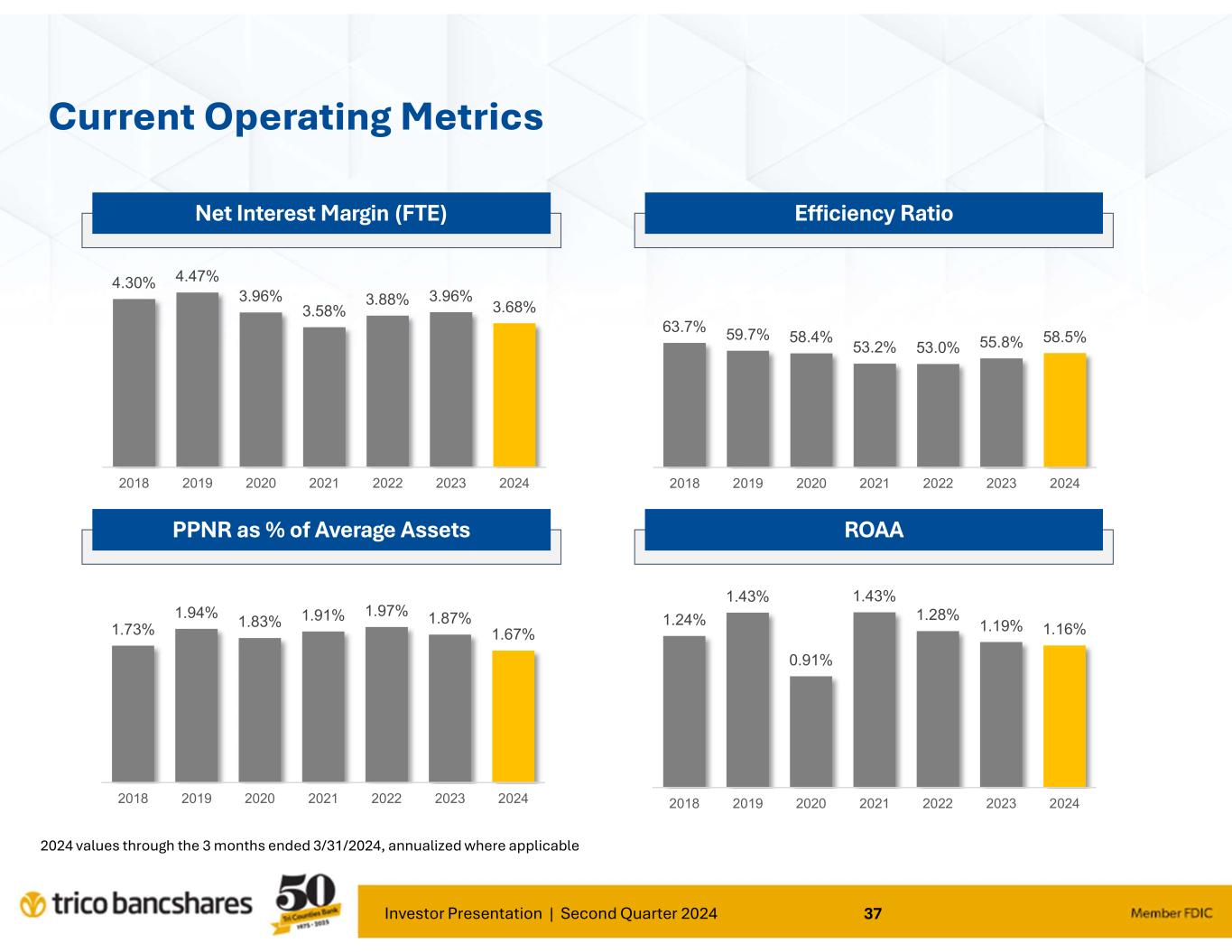Investor Presentation | Second Quarter 2024 37 1.24% 1.43% 0.91% 1.43% 1.28% 1.19% 1.16% 2018 2019 2020 2021 2022 2023 2024 1.73% 1.94% 1.83% 1.91% 1.97% 1.87% 1.67% 2018 2019 2020 2021 2022 2023 2024 63.7% 59.7% 58.4% 53.2% 53.0% 55.8% 58.5% 2018 2019 2020 2021 2022 2023 2024 4.30% 4.47% 3.96% 3.58% 3.88% 3.96% 3.68% 2018 2019 2020 2021 2022 2023 2024 Current Operating Metrics Net Interest Margin (FTE) PPNR as % of Average Assets Efficiency Ratio ROAA 2024 values through the 3 months ended 3/31/2024, annualized where applicable