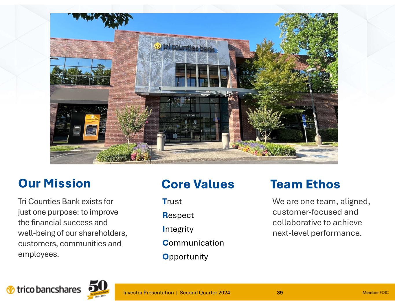 Investor Presentation | Second Quarter 2024 39 Our Mission Tri Counties Bank exists for just one purpose: to improve the financial success and well-being of our shareholders, customers, communities and employees. Core Values Trust Respect Integrity Communication Opportunity Team Ethos We are one team, aligned, customer-focused and collaborative to achieve next-level performance.
