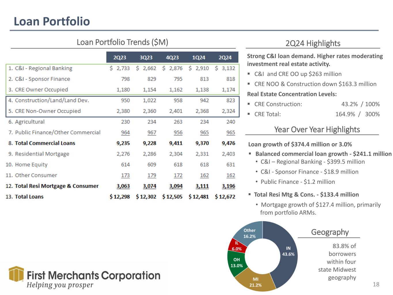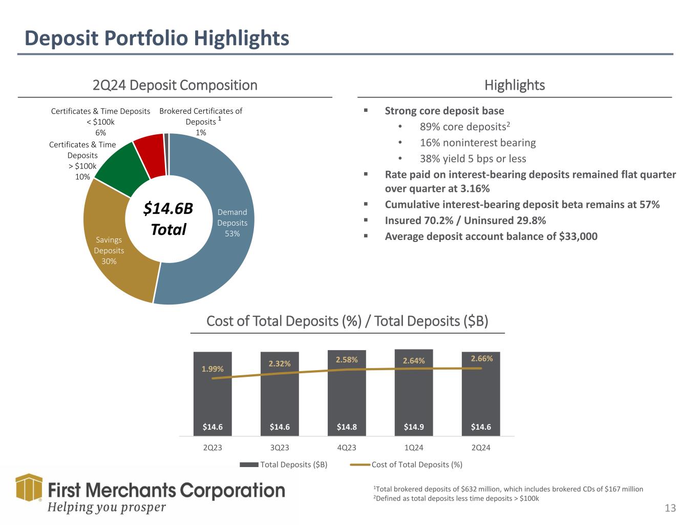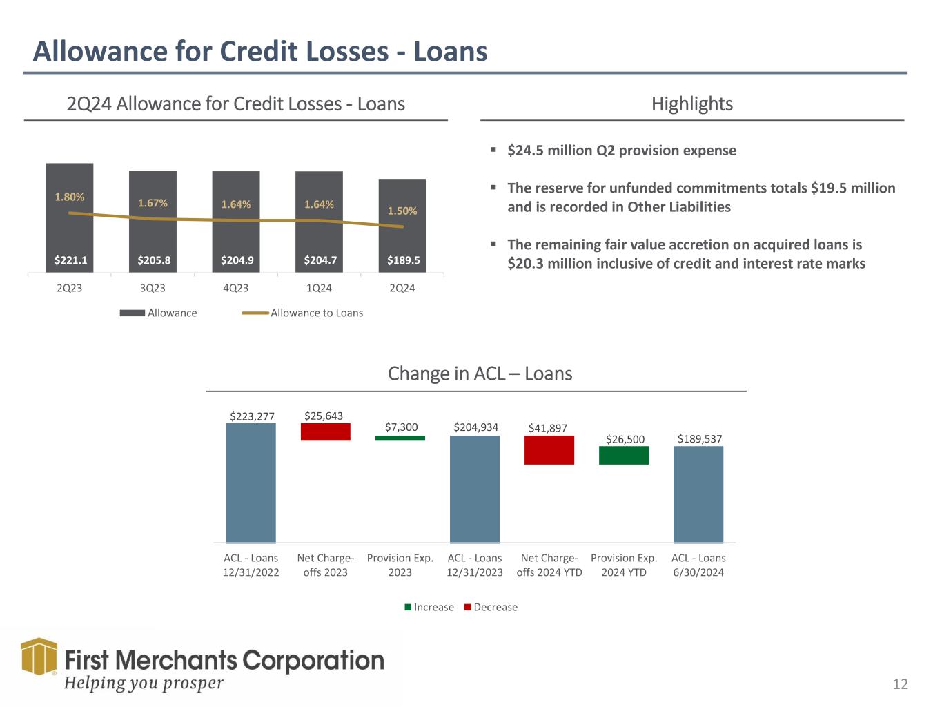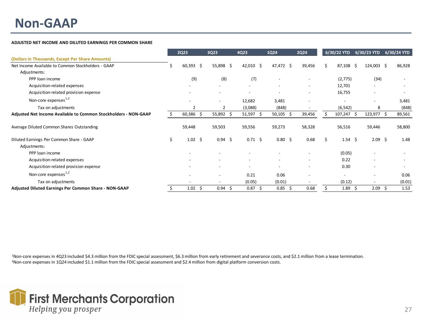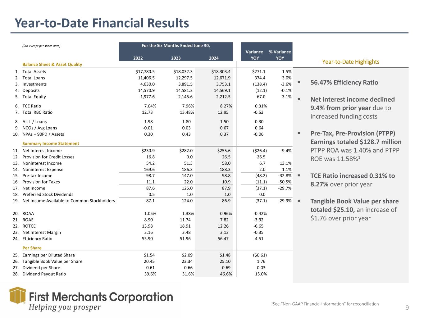 Forward Looking Statement This presentation contains forward-looking statements made pursuant to the safe-harbor provisions of the Private Securities Litigation Reform Act of 1995. Such forward-looking statements can often, but not always, be identified by the use of words like “believe”, “continue”, “pattern”, “estimate”, “project”, “intend”, “anticipate”, “expect” and similar expressions or future or conditional verbs such as “will”, “would”, “should”, “could”, “might”, “can”, “may”, or similar expressions. These forward-looking statements include, but are not limited to, statements relating to First Merchants’ goals, intentions and expectations; statements regarding the First Merchants’ business plan and growth strategies; statements regarding the asset quality of First Merchants’ loan and investment portfolios; and estimates of First Merchants’ risks and future costs and benefits. These forward-looking statements are subject to significant risks, assumptions and uncertainties that may cause results to differ materially from those set forth in forward-looking statements, including, among other things: possible changes in economic and business conditions; the existence or exacerbation of general geopolitical instability and uncertainty; the effects of a pandemic or other unforeseeable event; the ability of First Merchants to integrate recent acquisitions and attract new customers; possible changes in monetary and fiscal policies, and laws and regulations; the effects of easing restrictions on participants in the financial services industry; the cost and other effects of legal and administrative cases; possible changes in the credit worthiness of customers and the possible impairment of collectability of loans; fluctuations in market rates of interest; competitive factors in the banking industry; changes in the banking legislation or regulatory requirements of federal and state agencies applicable to bank holding companies and banks like First Merchants’ affiliate bank; continued availability of earnings and excess capital sufficient for the lawful and prudent declaration of dividends; changes in market, economic, operational, liquidity (including the ability to grow and maintain core deposits and retain large, uninsured deposits), credit and interest rate risks associated with the First Merchants’ business; and other risks and factors identified in each of First Merchants’ filings with the Securities and Exchange Commission. First Merchants undertakes no obligation to update any forward-looking statement, whether written or oral, relating to the matters discussed in this presentation or press release. In addition, the company’s past results of operations do not necessarily indicate its anticipated future results. NON-GAAP FINANCIAL MEASURES These slides contain non-GAAP financial measures. For purposes of Regulation G, a non-GAAP financial measure is a numerical measure of the registrant’s historical or future financial performance, financial position or cash flows that excludes amounts, or is subject to adjustments that have the effect of excluding amounts, that are included in the most directly comparable measure calculated and presented in accordance with GAAP in the statement of income, balance sheet or statement of cash flows (or equivalent statements) of the issuer; or includes amounts, or is subject to adjustments that have the effect of including amounts, that are excluded from the most directly comparable measure so calculated and presented. In this regard, GAAP refers to generally accepted accounting principles in the United States. Pursuant to the requirements of Regulation G, First Merchants Corporation has provided reconciliations within the slides, as necessary, of the non-GAAP financial measure to the most directly comparable GAAP financial measure.