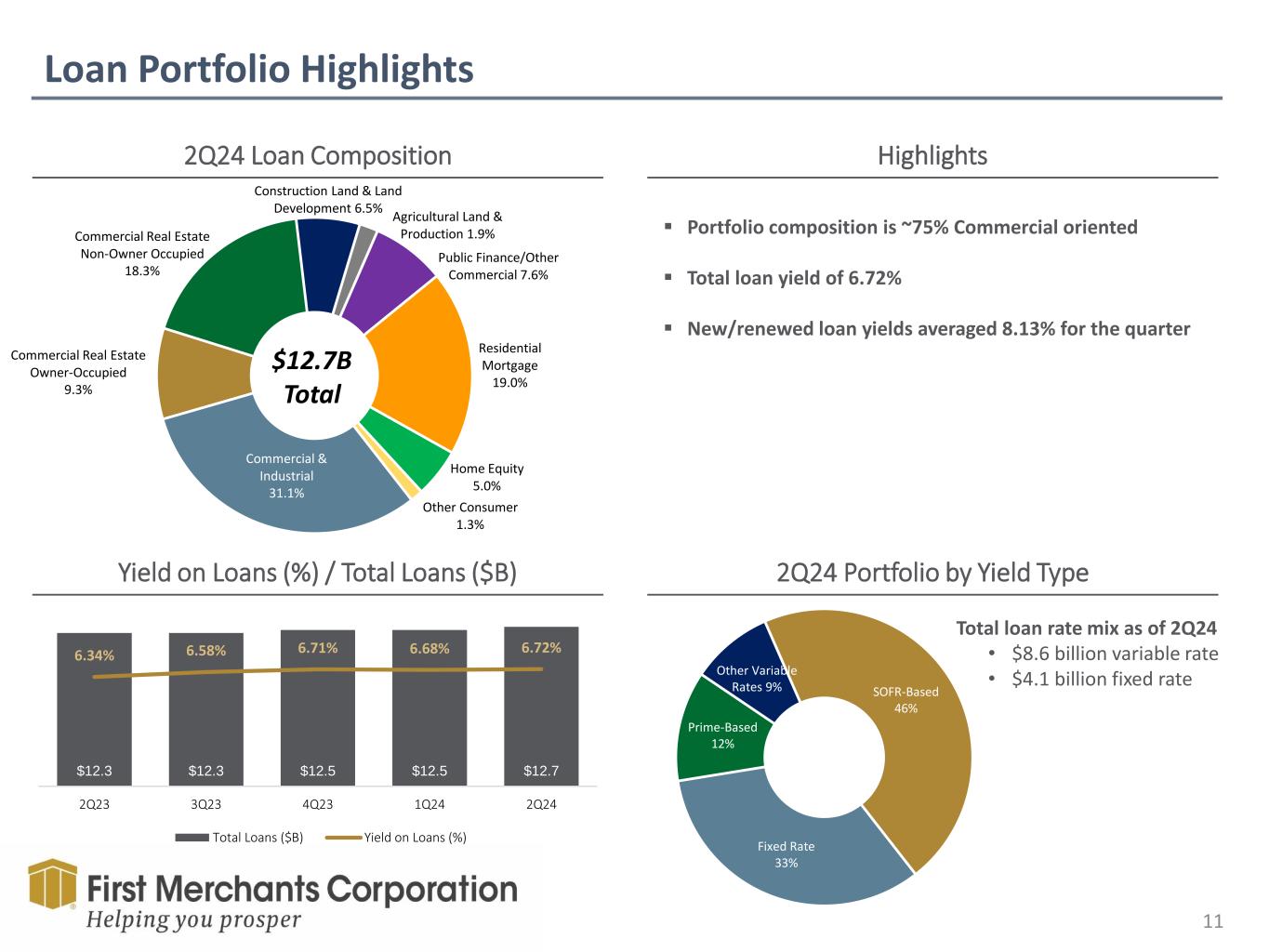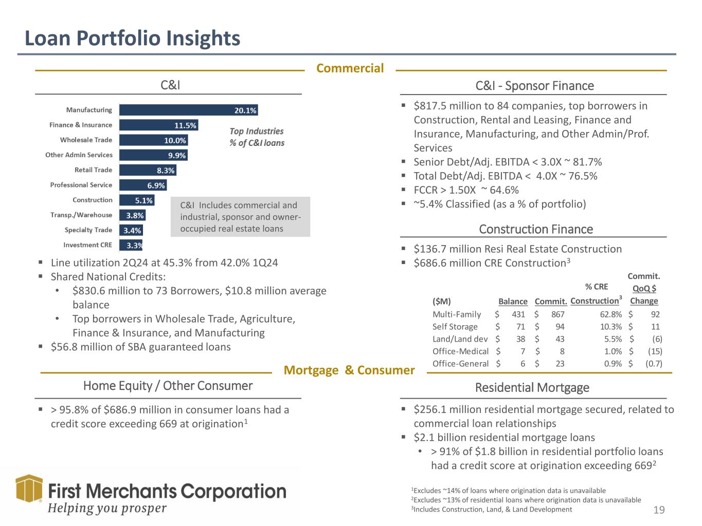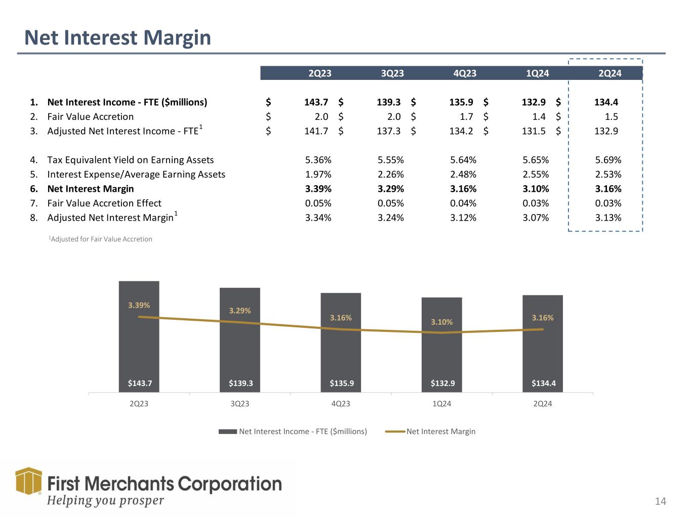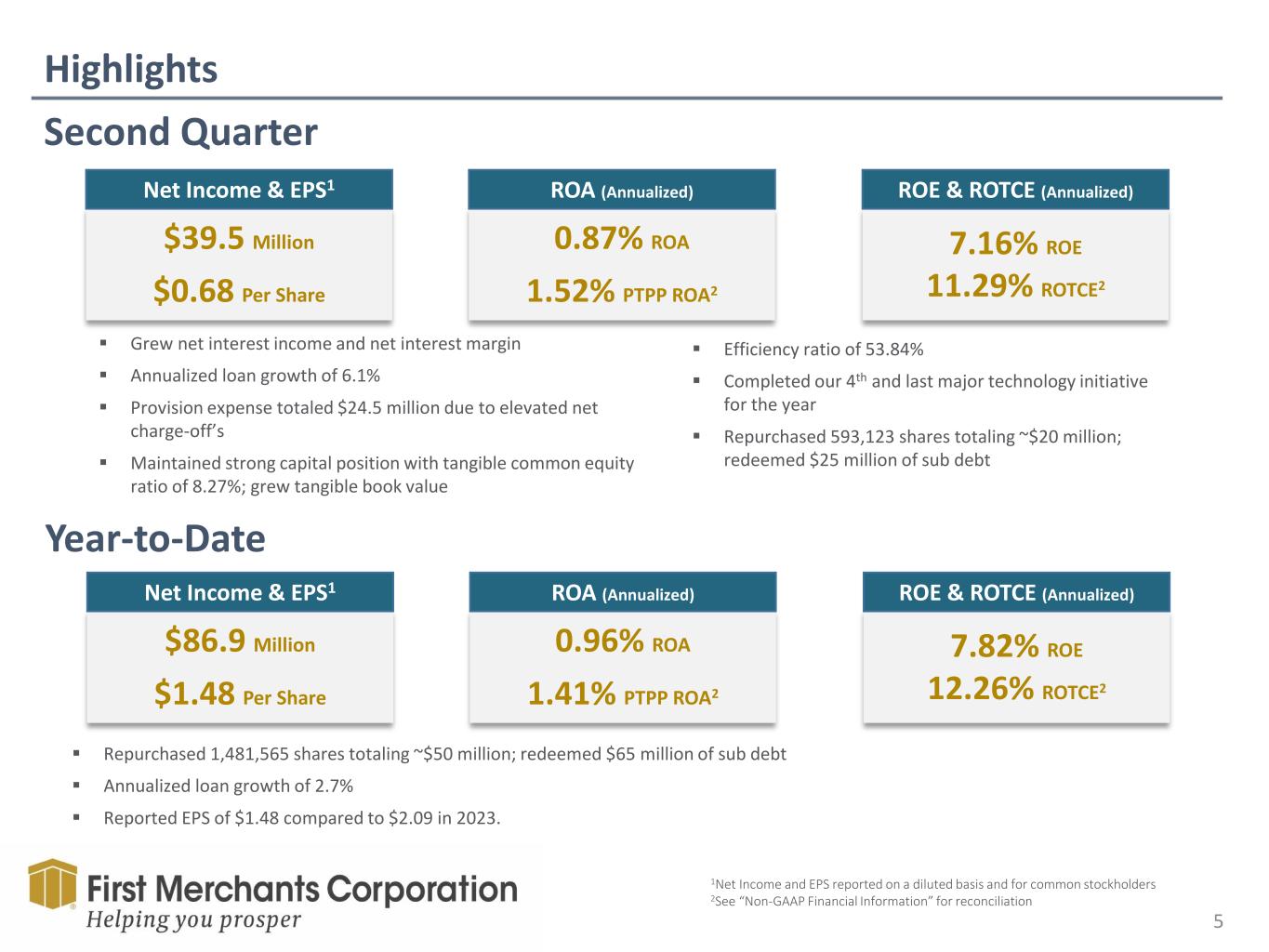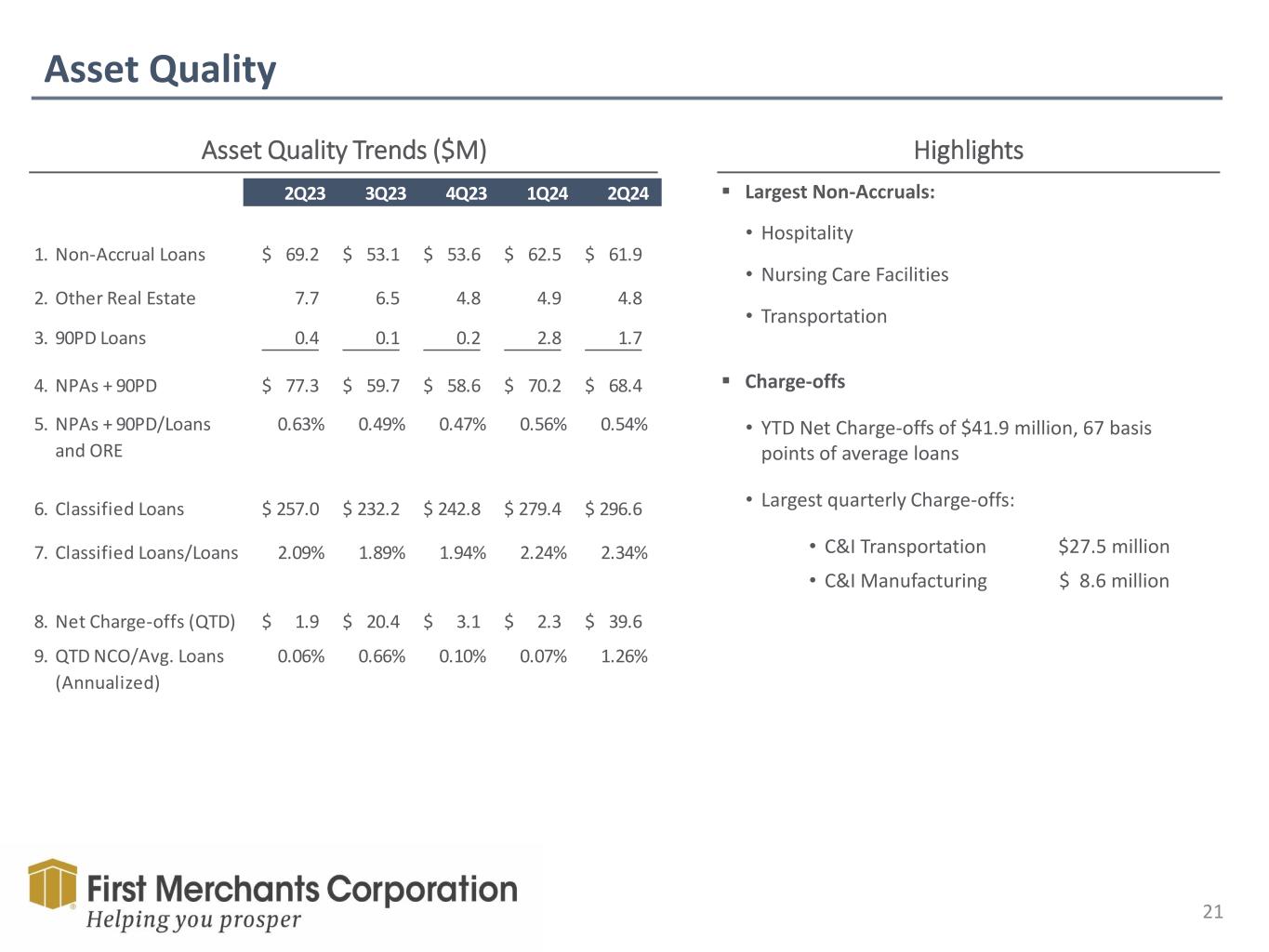 Forward Looking Statement This presentation contains forward-looking statements made pursuant to the safe-harbor provisions of the Private Securities Litigation Reform Act of 1995. Such forward-looking statements can often, but not always, be identified by the use of words like “believe”, “continue”, “pattern”, “estimate”, “project”, “intend”, “anticipate”, “expect” and similar expressions or future or conditional verbs such as “will”, “would”, “should”, “could”, “might”, “can”, “may”, or similar expressions. These forward-looking statements include, but are not limited to, statements relating to First Merchants’ goals, intentions and expectations; statements regarding the First Merchants’ business plan and growth strategies; statements regarding the asset quality of First Merchants’ loan and investment portfolios; and estimates of First Merchants’ risks and future costs and benefits. These forward-looking statements are subject to significant risks, assumptions and uncertainties that may cause results to differ materially from those set forth in forward-looking statements, including, among other things: possible changes in economic and business conditions; the existence or exacerbation of general geopolitical instability and uncertainty; the effects of a pandemic or other unforeseeable event; the ability of First Merchants to integrate recent acquisitions and attract new customers; possible changes in monetary and fiscal policies, and laws and regulations; the effects of easing restrictions on participants in the financial services industry; the cost and other effects of legal and administrative cases; possible changes in the credit worthiness of customers and the possible impairment of collectability of loans; fluctuations in market rates of interest; competitive factors in the banking industry; changes in the banking legislation or regulatory requirements of federal and state agencies applicable to bank holding companies and banks like First Merchants’ affiliate bank; continued availability of earnings and excess capital sufficient for the lawful and prudent declaration of dividends; changes in market, economic, operational, liquidity (including the ability to grow and maintain core deposits and retain large, uninsured deposits), credit and interest rate risks associated with the First Merchants’ business; and other risks and factors identified in each of First Merchants’ filings with the Securities and Exchange Commission. First Merchants undertakes no obligation to update any forward-looking statement, whether written or oral, relating to the matters discussed in this presentation or press release. In addition, the company’s past results of operations do not necessarily indicate its anticipated future results. NON-GAAP FINANCIAL MEASURES These slides contain non-GAAP financial measures. For purposes of Regulation G, a non-GAAP financial measure is a numerical measure of the registrant’s historical or future financial performance, financial position or cash flows that excludes amounts, or is subject to adjustments that have the effect of excluding amounts, that are included in the most directly comparable measure calculated and presented in accordance with GAAP in the statement of income, balance sheet or statement of cash flows (or equivalent statements) of the issuer; or includes amounts, or is subject to adjustments that have the effect of including amounts, that are excluded from the most directly comparable measure so calculated and presented. In this regard, GAAP refers to generally accepted accounting principles in the United States. Pursuant to the requirements of Regulation G, First Merchants Corporation has provided reconciliations within the slides, as necessary, of the non-GAAP financial measure to the most directly comparable GAAP financial measure.