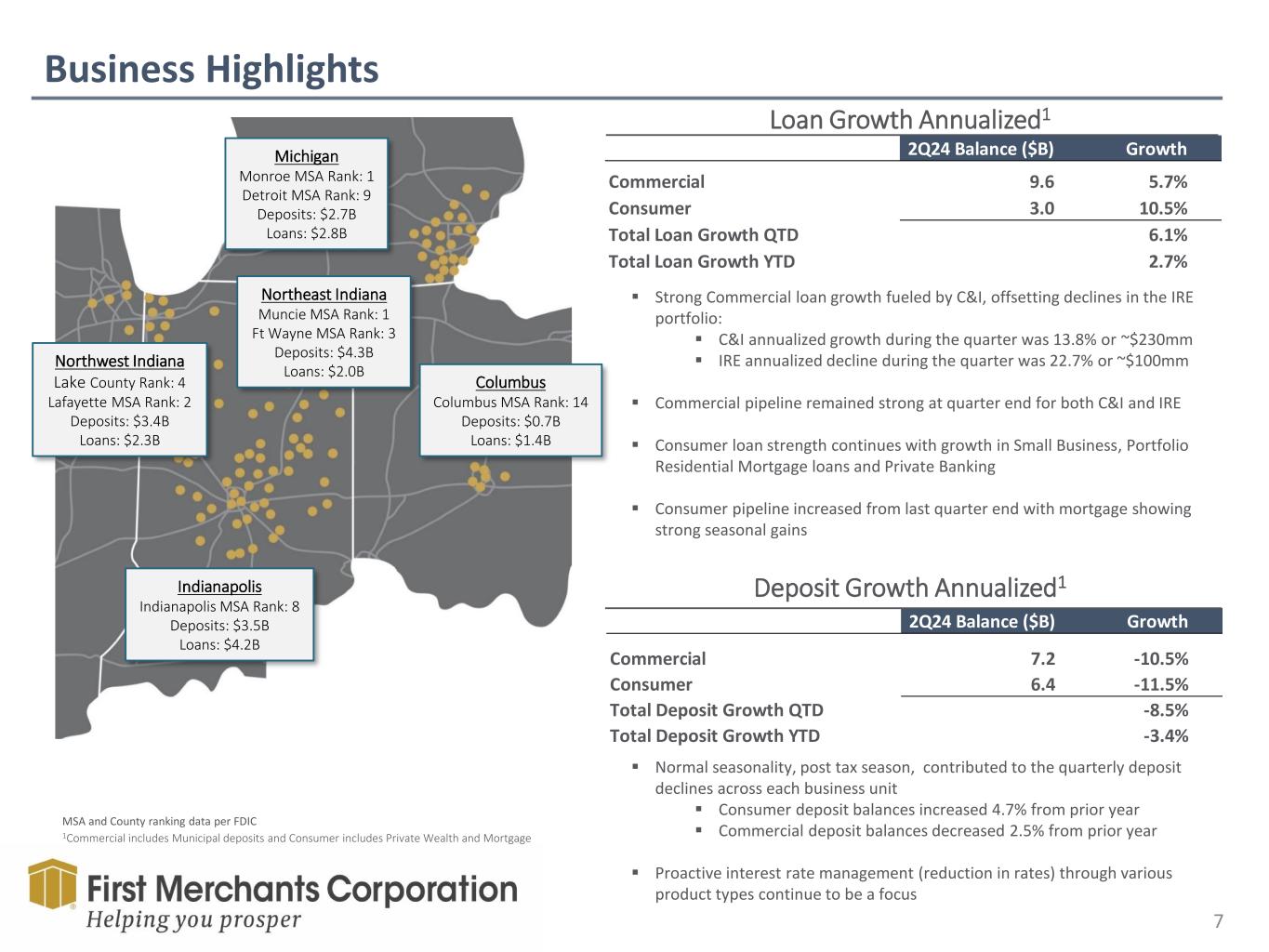 Business Strategy 6 Full Spectrum of Debt Capital and Treasury Service Offerings Located in Prime Growth Markets Small Business & SBA Middle Market C&I Investment Real Estate Public Finance Sponsor Finance Full Spectrum of Consumer Deposit and Lending Offerings Supported by: Talented, Customer Service Oriented Banking Center and Call Center Professionals Competitive Digital Solutions ▪ Deposit and CRM ▪ Online Banking ▪ Mobile Banking Diverse Locations in Stable Rural and Growth Metro Markets Comprehensive and coordinated approach to personal wealth management Expertise in: Investment Management Private Banking Fiduciary Estate Financial Planning Strengthen commercial relationships with personal services for executives/owners and retirement plan services for companies Partner with consumer to offer personal investment advice through First Merchants Investment Services Offering a full suite of mortgage solutions to assist with purchase, construction, renovation, and home finance Strengthen existing Commercial, Consumer and Private Wealth relationships Create new household relationships Support underserved borrowers and neighborhoods Deliver solutions through a personalized, efficient, and scalable model Commercial Banking Private Wealth Advisors Consumer Banking Mortgage Banking Asset Based Lending Syndications Treasury Management Services Merchant Processing Services
