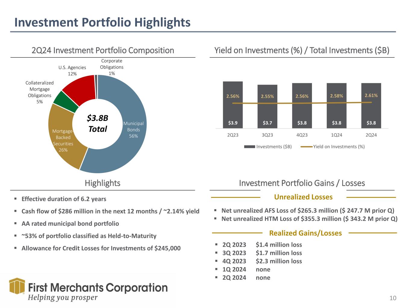 Year-to-Date Financial Results 9 ▪ 56.47% Efficiency Ratio ▪ Net interest income declined 9.4% from prior year due to increased funding costs ▪ Pre-Tax, Pre-Provision (PTPP) Earnings totaled $128.7 million PTPP ROA was 1.40% and PTPP ROE was 11.58%1 ▪ TCE Ratio increased 0.31% to 8.27% over prior year ▪ Tangible Book Value per share totaled $25.10, an increase of $1.76 over prior year Year-to-Date Highlights 1See “Non-GAAP Financial Information” for reconciliation ($M except per share data) 2022 2023 2024 Variance YOY % Variance YOY Balance Sheet & Asset Quality 1. Total Assets $17,780.5 $18,032.3 $18,303.4 $271.1 1.5% 2. Total Loans 11,406.5 12,297.5 12,671.9 374.4 3.0% 3. Investments 4,630.0 3,891.5 3,753.1 (138.4) -3.6% 4. Deposits 14,570.9 14,581.2 14,569.1 (12.1) -0.1% 5. Total Equity 1,977.6 2,145.6 2,212.5 67.0 3.1% 6. TCE Ratio 7.04% 7.96% 8.27% 0.31% 7. Total RBC Ratio 12.73 13.48% 12.95 -0.53 8. ALLL / Loans 1.98 1.80 1.50 -0.30 9. NCOs / Avg Loans -0.01 0.03 0.67 0.64 10. NPAs + 90PD / Assets 0.30 0.43 0.37 -0.06 Summary Income Statement 11. Net Interest Income $230.9 $282.0 $255.6 ($26.4) -9.4% 12. Provision for Credit Losses 16.8 0.0 26.5 26.5 13. Noninterest Income 54.2 51.3 58.0 6.7 13.1% 14. Noninterest Expense 169.6 186.3 188.3 2.0 1.1% 15. Pre-tax Income 98.7 147.0 98.8 (48.2) -32.8% 16. Provision for Taxes 11.1 22.0 10.9 (11.1) -50.5% 17. Net Income 87.6 125.0 87.9 (37.1) -29.7% 18. Preferred Stock Dividends 0.5 1.0 1.0 0.0 19. Net Income Available to Common Stockholders 87.1 124.0 86.9 (37.1) -29.9% 20. ROAA 1.05% 1.38% 0.96% -0.42% 21. ROAE 8.90 11.74 7.82 -3.92 22. ROTCE 13.98 18.91 12.26 -6.65 23. Net Interest Margin 3.16 3.48 3.13 -0.35 24. Efficiency Ratio 55.90 51.96 56.47 4.51 Per Share 25. Earnings per Diluted Share $1.54 $2.09 $1.48 ($0.61) 26. Tangible Book Value per Share 20.45 23.34 25.10 1.76 27. Dividend per Share 0.61 0.66 0.69 0.03 28. Dividend Payout Ratio 39.6% 31.6% 46.6% 15.0% For the Six Months Ended June 30,