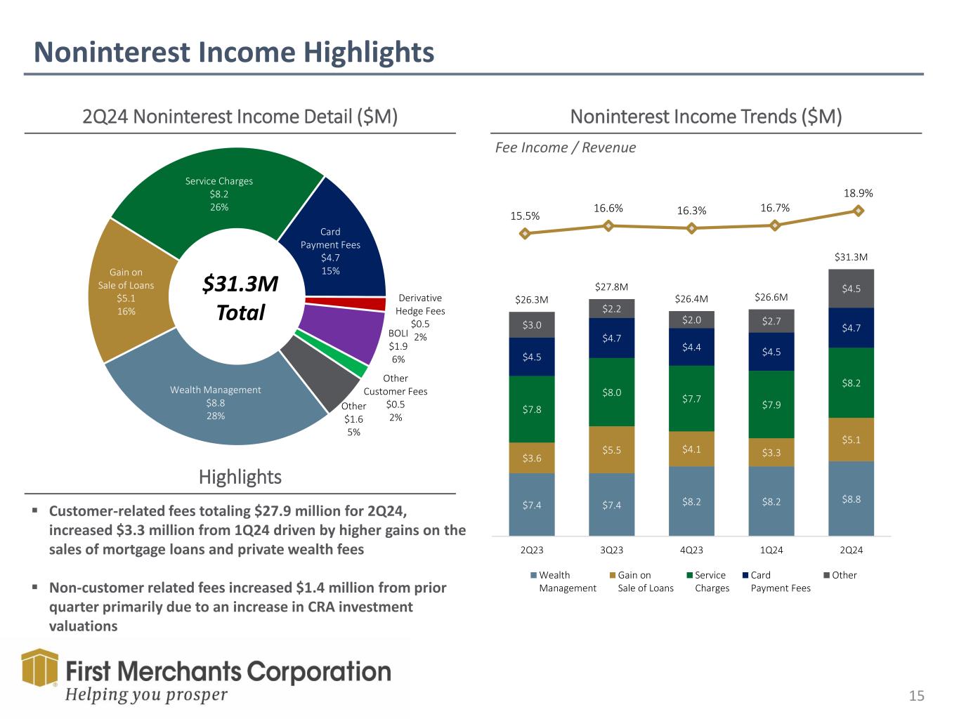 Net Interest Margin 14 $105.1$97.1 $97.3 $105.1 $107.0$97.8 $107.0 $97.3 $105.1 $110.0$109.2 $107.0 $105.1 $109.2 $110.0 $106.9 1Adjusted for Fair Value Accretion $143.7 $139.3 $135.9 $132.9 $134.4 3.39% 3.29% 3.16% 3.10% 3.16% 2Q23 3Q23 4Q23 Q24 2Q24 Net Interest Income - FTE ($millions) Net Interest Margin 2Q23 3Q23 4Q23 1Q24 2Q24 1. Net Interest Income - FTE ($millions) 143.7$ 139.3$ 135.9$ 132.9$ 134.4$ 2. Fair Value Accretion 2.0$ 2.0$ 1.7$ 1.4$ 1.5$ 3. Adjusted Net Interest Income - FTE 1 141.7$ 137.3$ 134.2$ 131.5$ 132.9$ 4. Tax Equivalent Yield on Earning Assets 5.36% 5.55% 5.64% 5.65% 5.69% 5. Interest Expense/Average Earning Assets 1.97% 2.26% 2.48% 2.55% 2.53% 6. Net Interest Margin 3.39% 3.29% 3.16% 3.10% 3.16% 7. Fair Value Accretion Effect 0.05% 0.05% 0.04% 0.03% 0.03% 8. Adjusted Net Interest Margin 1 3.34% 3.24% 3.12% 3.07% 3.13%
