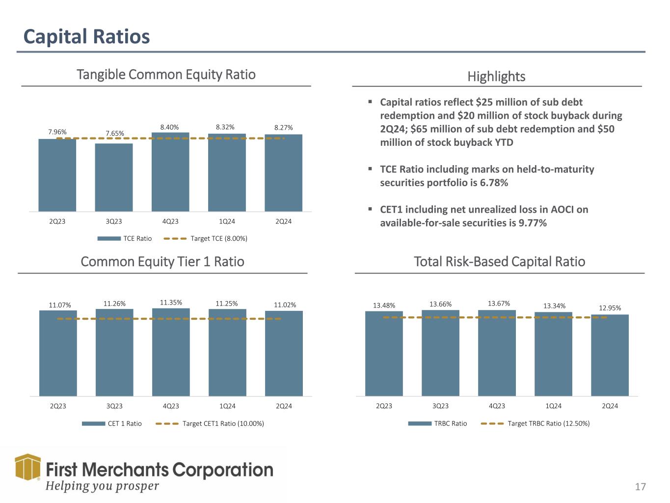 52.21% 53.91% 63.26% 59.21% 53.84% Salary & Benefits $52.2 57% Premises & Equipment $13.3 14% Outside Data Processing $7.1 8% Professional & Other Outside Services $3.8 4% Intangible Asset Amortization $1.8 2%Marketing $1.8 2% FDIC Expense $3.3 4% Other $8.1 9% Noninterest Expense Highlights 16 2Q24 Noninterest Expense Detail $91.4M Total Noninterest Expense Trends ($M) Efficiency Ratio Highlights ▪ Decrease from Q1 driven by a $6.1 million decline in salaries and benefits and a $1 million decline in FDIC assessments. Offsetting these declines was the inclusion of $0.7 million of gains on the sale of properties in the prior quarter recorded in Other Expenses. 14Q23 & 1Q24 Efficiency Ratio excluding non-core expenses, see “Non-GAAP Financial Information” for reconciliation 55.56%1 57.03%1 $54.8 $55.6 $60.9 $58.3 $52.2 $12.9 $12.5 $15.2 $13.5 $13.3 $6.6 $6.6 $5.9 $6.9 $7.1 $18.3 $19.2 $26.1 $18.2 $18.8 $92.6M $93.9M $108.1M $96.9M $91.4M 2Q23 3Q23 4Q23 1Q24 2Q24 Salary & Benefits Premises & Equipment Outside Data Processing Other